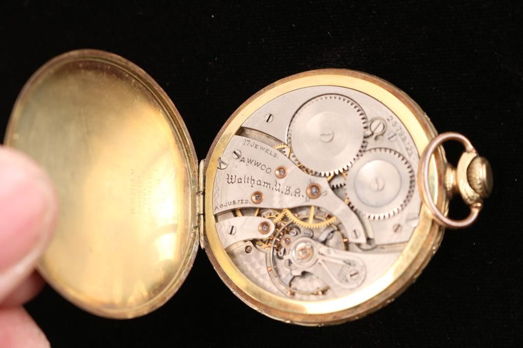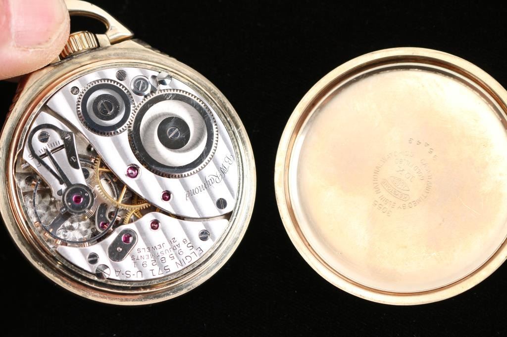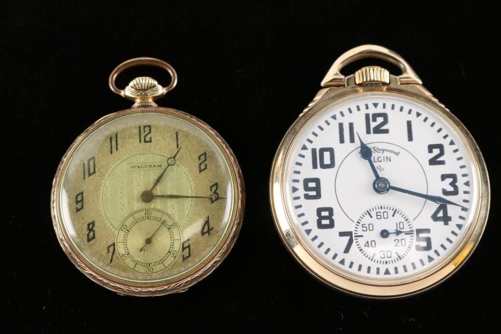 1) 1924 Art Deco Waltham Colonial B Pocket Watch 12 size,17Jewel, grade 1235. Number 23798123, manufactured 1924. Case marked Waltham Colonial 14K gold filled. 20 Elgin grade 571, model 20 pocket watch with B.W. Raymond dial. Size 16, 21 jewel. Movement marked B.W. Raymond, 8 adjustments, number S958291, manufactured 1952. 3055 case has elgin markings with Keystone J. Boss 10K gold filled. In good working order.