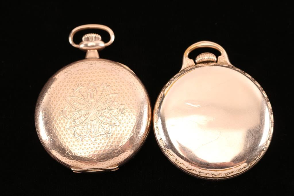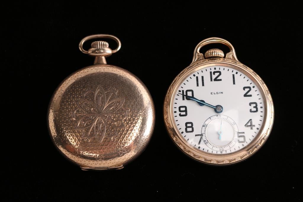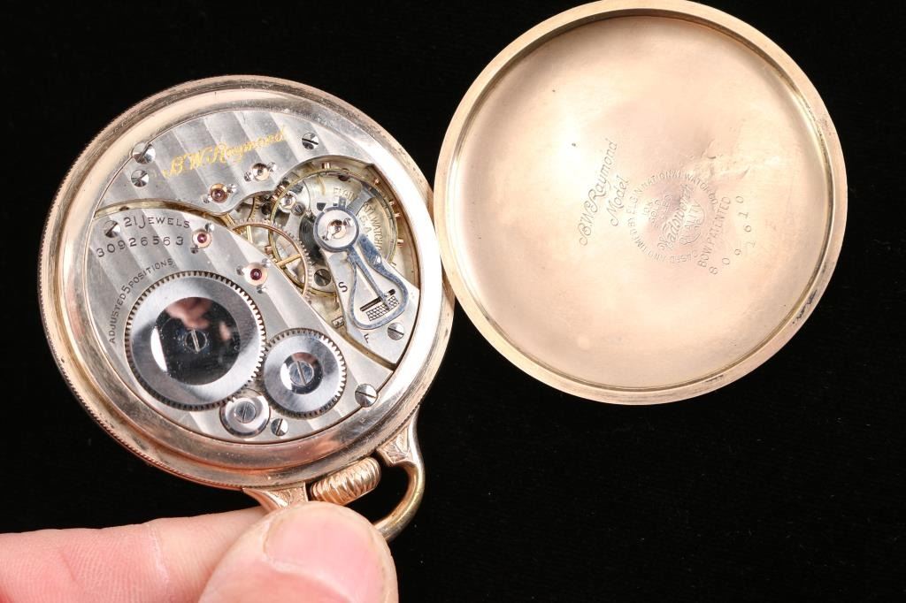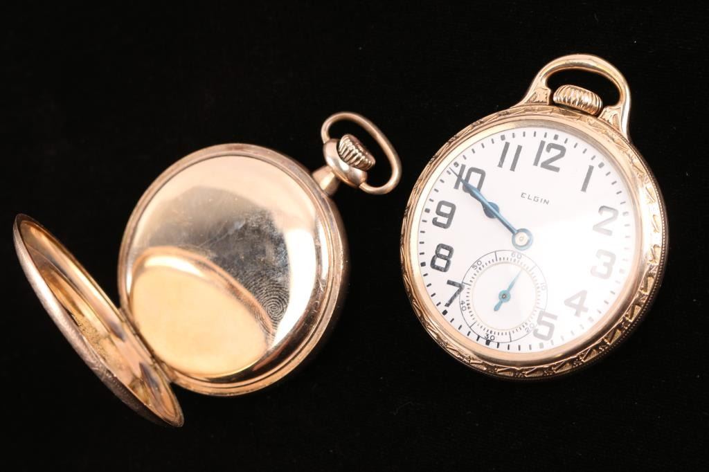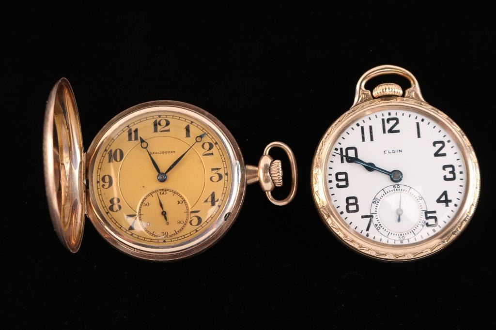 1) Illinois 'Burlington' grade 107 model 8, 16 size, 21 jewel. Number 3151882, manufactured 1917. Burlington "two plates of solid gold" 25 year hunter case. In good working order. 2) Elgin 'B.W. Raymond grade 478 model 15, 16 size, 21 jewel. Number 30926563, manufactured 1928. Railroad grade. 10K gold filled 'B.W. Raymond' marked Wadsworth case.