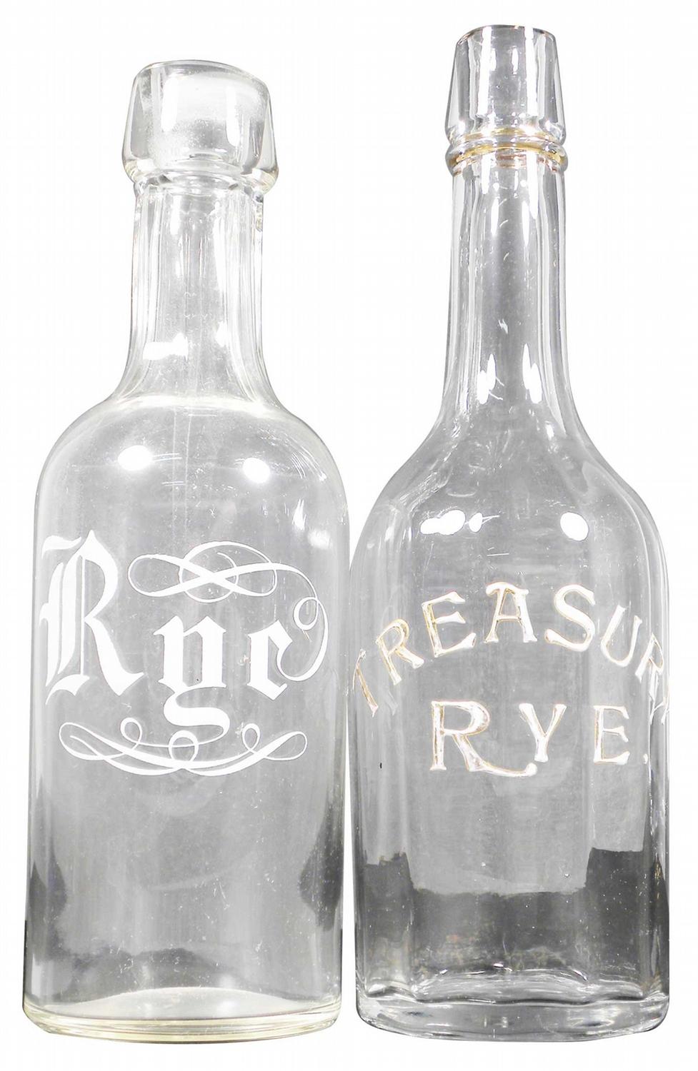 Lot of Two Etched Glass Whiskey Bottles. Treasury Rye and Rye. No chips or cracks. Tallest measures 11 1/2 inches tall.