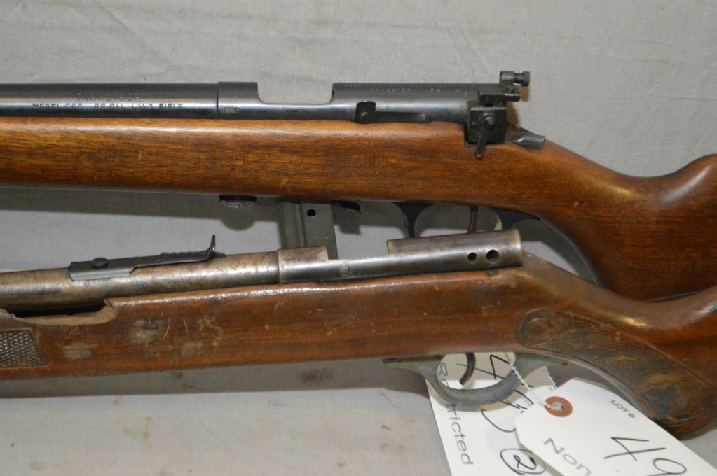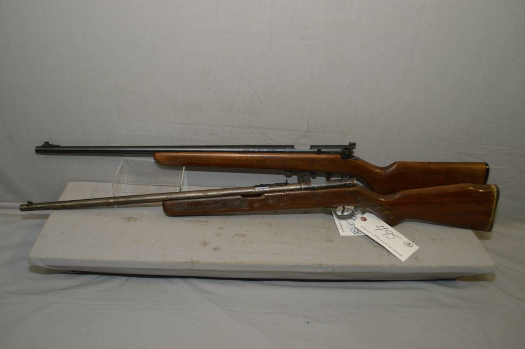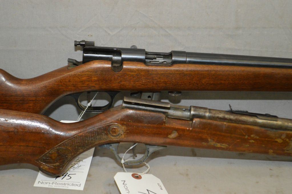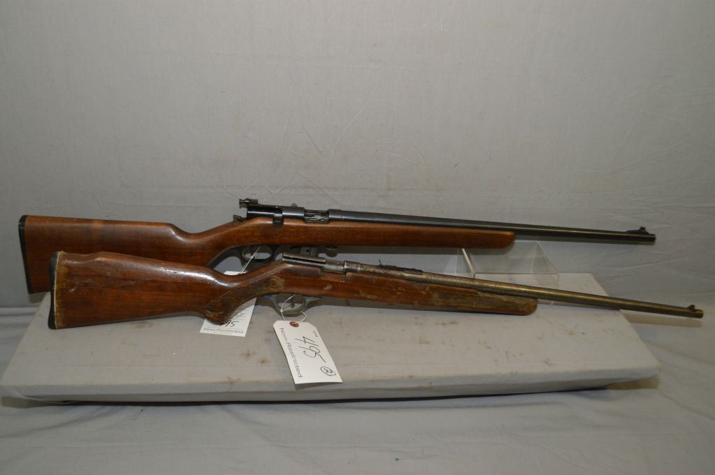 Lot of Two Firearms Missing Bolts - H & R Model Targeter .22 LR Cal Mag Fed Bolt Action Rifle w/ 22" bbl [ blued finish, rear peep sight, with mag, No bolt ] Ser # 3021 - Hiawatha Model Single Shot .22 LR Cal Single Shot Bolt Action Rifle w/24" bbl [ poor finish, barrel sights, large chip out of forend, no bolt ] Ser # Nil