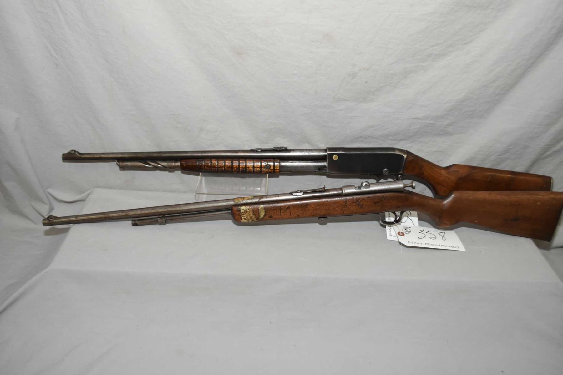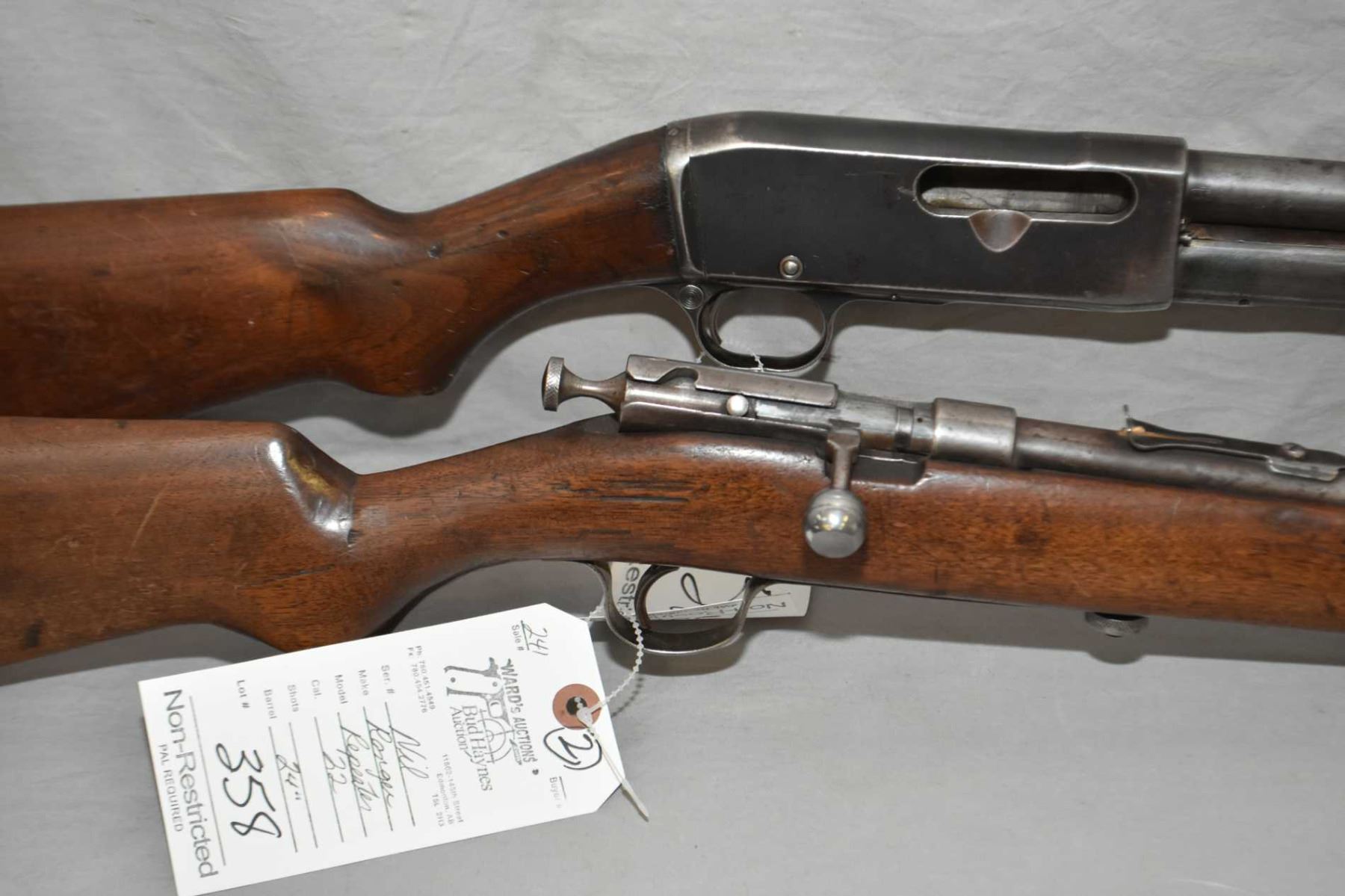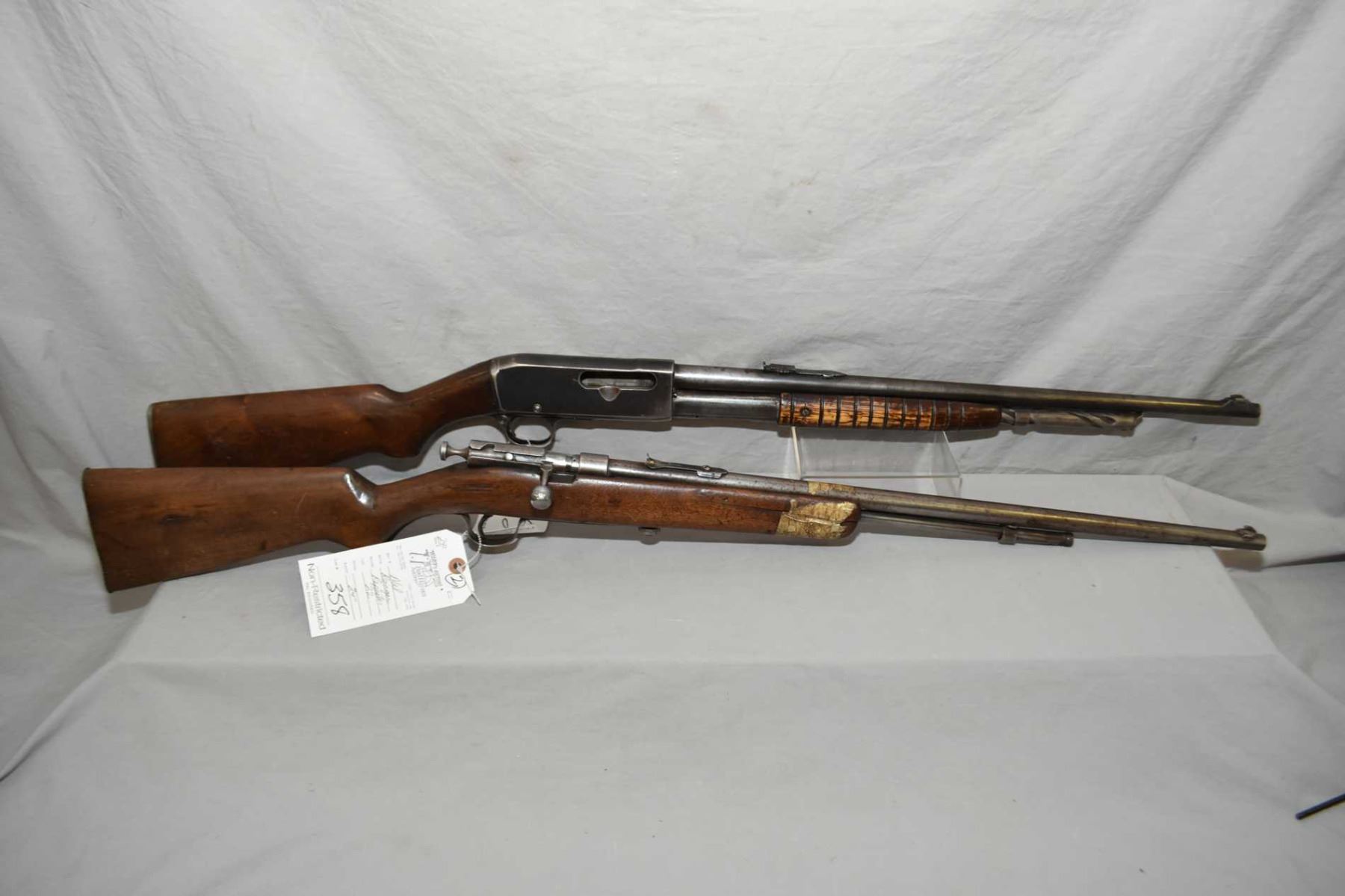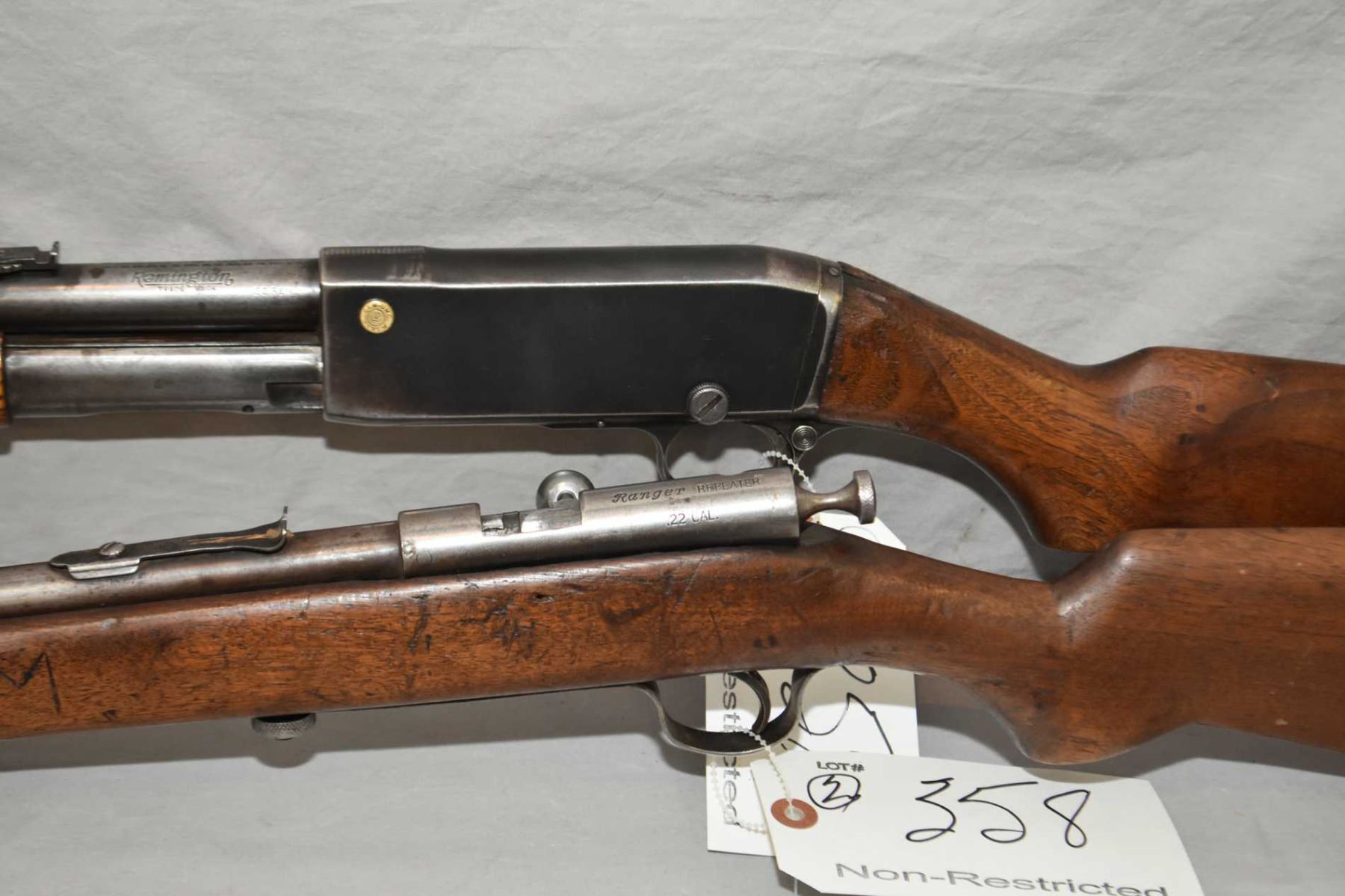 Lot of Two Firearms : Remington Model 14 - A .30 Rem Cal Pump Action Rifle w/ 22" bbl [ fading blue finish, barrel sights, missing the bolt etc, grooved forend, starting to fade, butt stock cracked and chipped behind receiver, etc., Remington UMC butt plate ] Ser # 75222 - Ranger Model Repeater .22 Cal Tube Fed Bolt Action Rifle w/ 24" bbl [ faded blue finish, turning brown, barrel sights missing the lift, stock sanded down at wrist, and cracked and taped at forend, various other marks and cracks, metal butt plate ] Ser # Nil