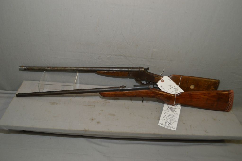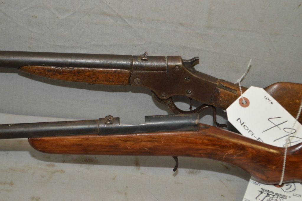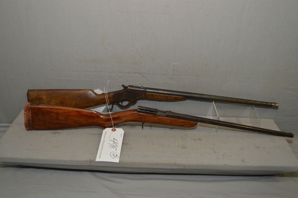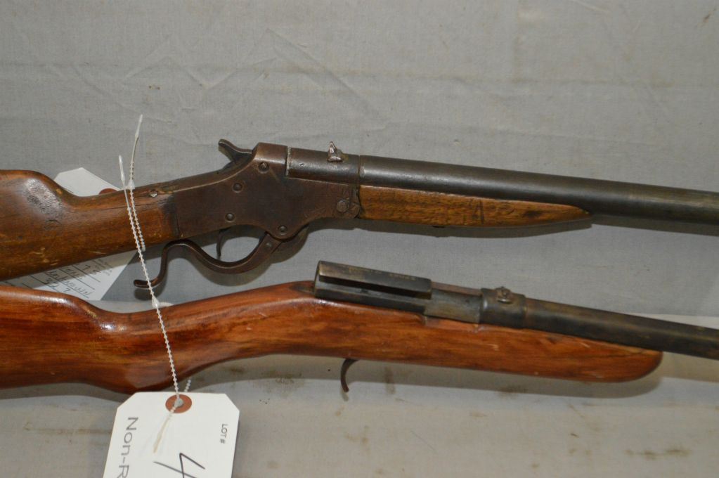 Lot of Two Firearms : Stevens Model Unknown .32 Cal ? Single Shot Break Action Rifle w/ 20" bbl [ blued finish turned brown, cracked & broken stock, poor all over ] Ser # H575 - Cooey Model Sport .22 LR Cal Single Shot Bolt Action Rifle w/ 17" bbl [ faded patchy blue finish, barrel sights, cracked stock, with dry recoil pad, missing bolt & trigger guard ] Ser # Nil