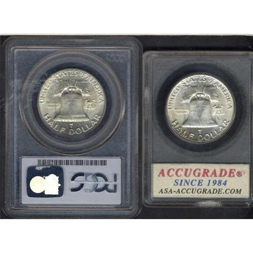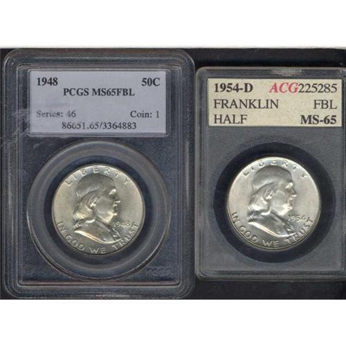<b>Lot of Two Franklin Half Dollars.</b> Includes: 1948 PCGS MS65FBL and 1954-D Accugrade MS65FBL. Lot of 2 coins.