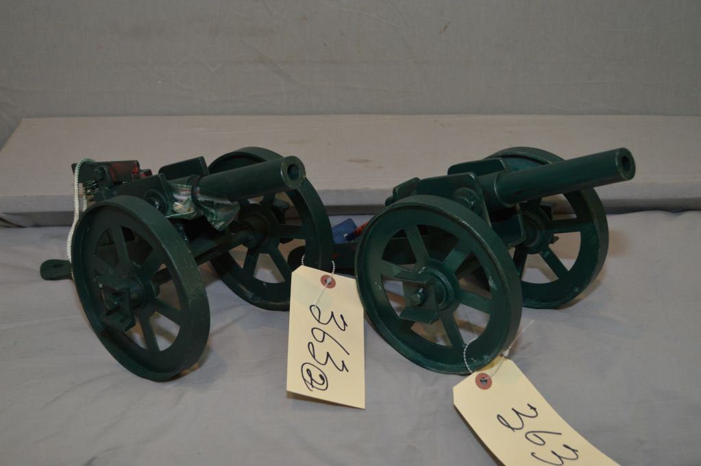 Lot of Two Hand Made .50 Cal Cannons [ barrels approx. 7" long, cannon with carriage approx. 15" long, one is .50 Cal Perc - the other is .50 Cal fuse type, both painted green, with 6" wheels ]