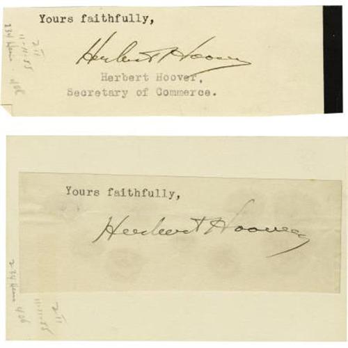 <B>Lot of Two Herbert Hoover Signatures</B></I> Each signed “<I>Herbert Hoover</B></I>”. Each measuring about 4.5” x 1.5”, the paper toned, else near fine signatures. One of the signatures was signed while Hoover served as Secretary of Commerce. One signature is mounted on a larger 3” x 5” card. <I>Ex. Henry E. Luhrs Collection.</B></I> <BR><BR><b>Shipping:</b> Flat Material, Small (<a target="_blank" href="http://www.heritageauctions.com/common/shipping.php">view shipping information</a>)