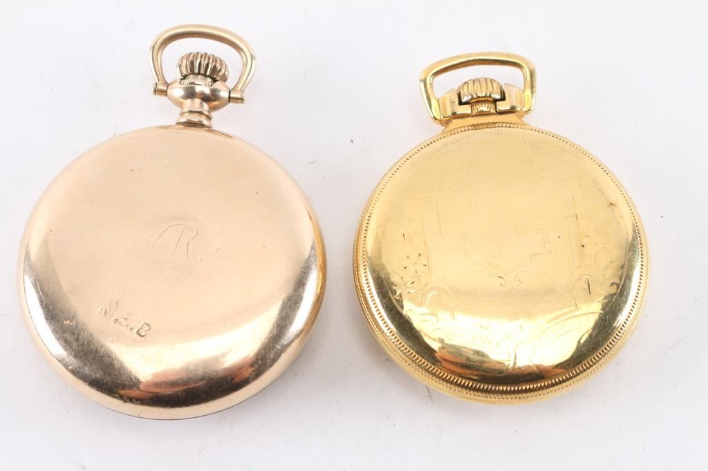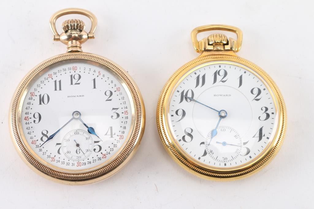 1) E. Howard series 5 grade model 1907, 16 size, 19 jewel, ruby & sapphire. Number 1115082, manufactured 1911. Railroad grade, hooked bridge, jeweled barrel. Keystone, J.Boss 10K gold filled case. 2) E. Howard series 11 model E, 16 size, 21 jewel. Number 1317212, manufactured 1916. Railroad grade. Keystone Extra gold filled case. In good working order.
