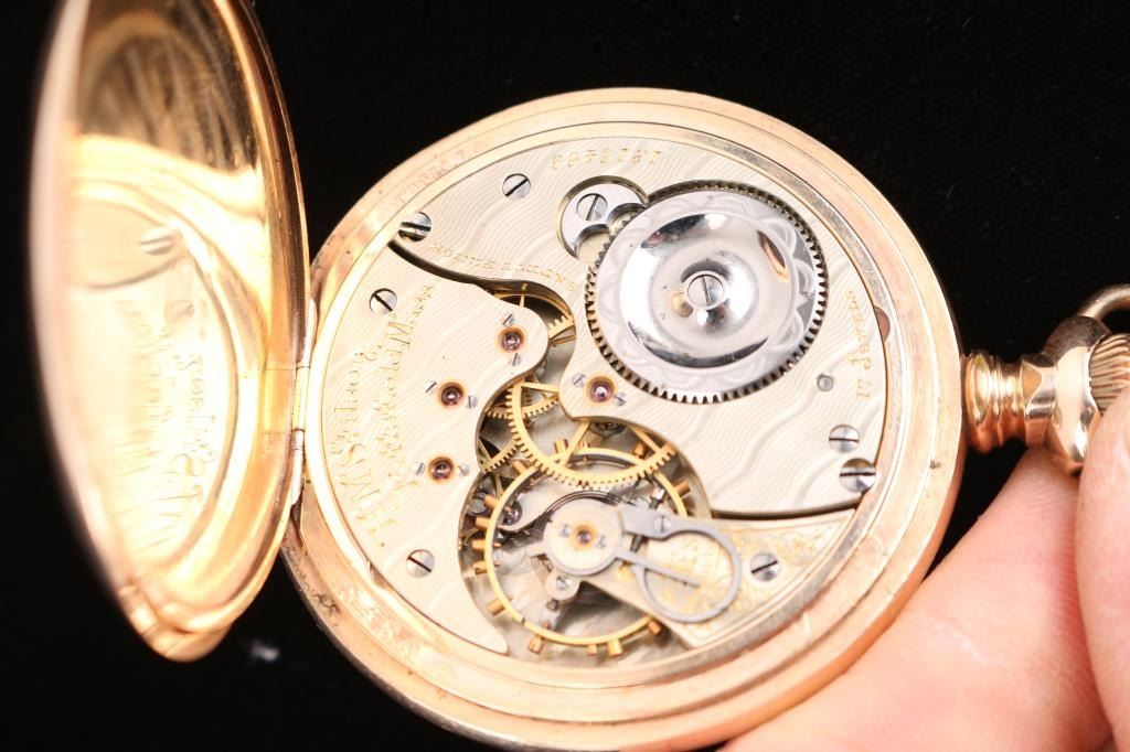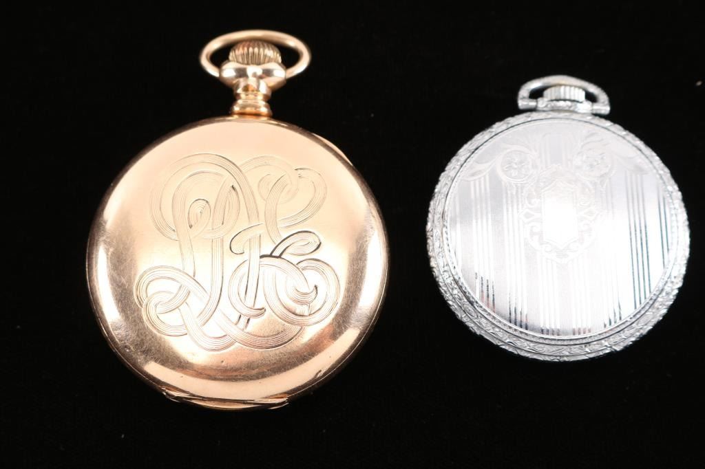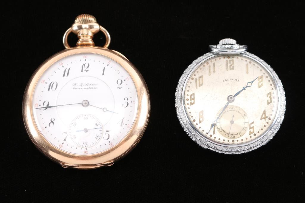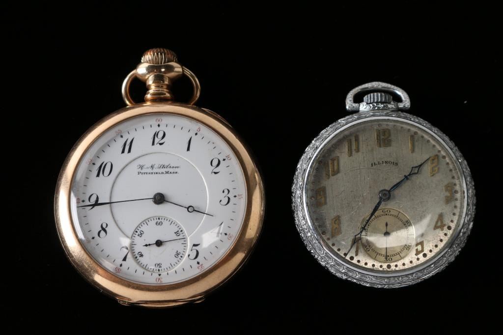 1) Illinois grade405 model 13, 12 size, 17 jewel. Number 3983592, manufactured 1922. Housed in a Illinois Spartan base metal case. In good working order. 2) Illinois grade 174 model 5, 16 size, 17 jewel. "H. M. Stilson Springfield, Mass". private label on face and movement. Number 1316469, manufactured 1896, 100 run quantity. Gold filled Crescent 20 year case. Intertwined initials on back of case. In good working order,