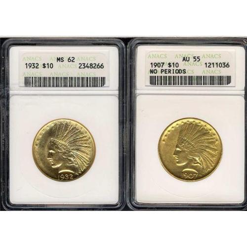 <b>Lot of Two Indian Head Eagles.</b> Includes a 1907 ANACS AU55 No Periods and a 1932 ANACS MS62. Lot of 2 coins.