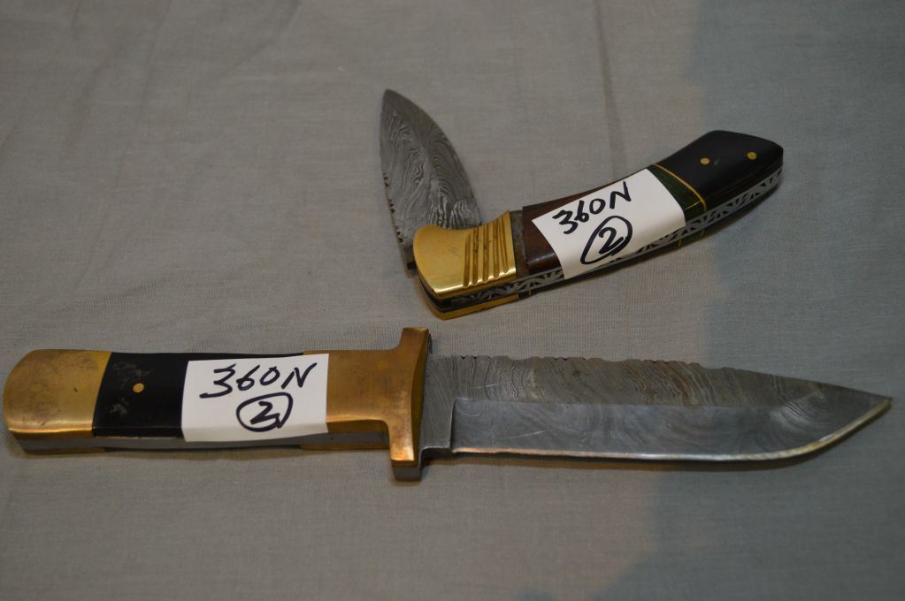 Lot of Two Items : Damascus Hand Forged Knives [ one hunting - one folding w/leather sheaths ]
