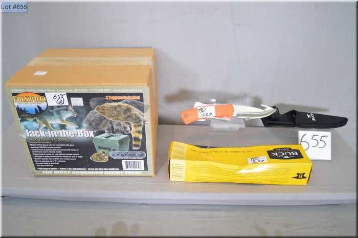 Lot of Two Items : Foxpro Jack in the Box Game Call Decoy New in orig box Retail $ 199.00 - Buck Model 679 Hunting Knife w/gut hook , fluorescent handle & nylon sheath New w/orig box Retail $ 60.00