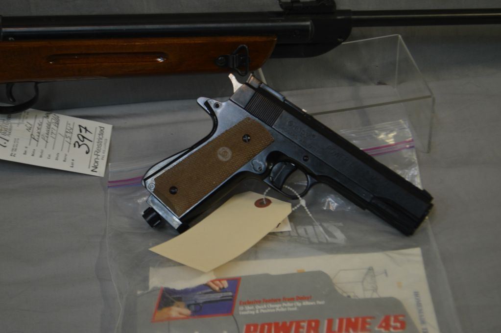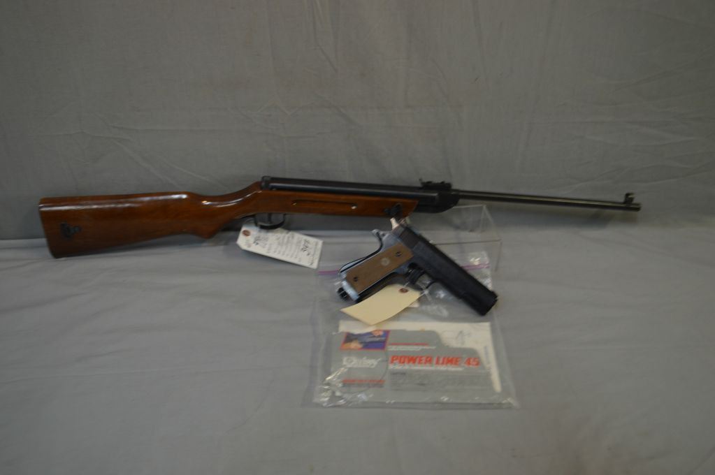 Lot of Two Items : Pioneer ( China ) Model Pioneer ( G 6432 ) .177 Pellet Cal Single Shot Pellet Rifle w/ 15 3/4" bbl [ blued finish, wooden stock, appears good ] Ser # Nil PAL REQ - C/w Daisy Power Line 45 C02 Pellet Pistol [ appears v-good w/booklet ] NO PAL REQ