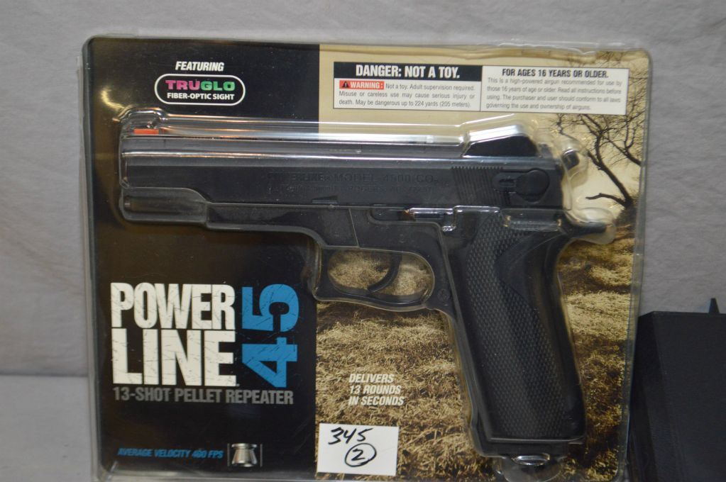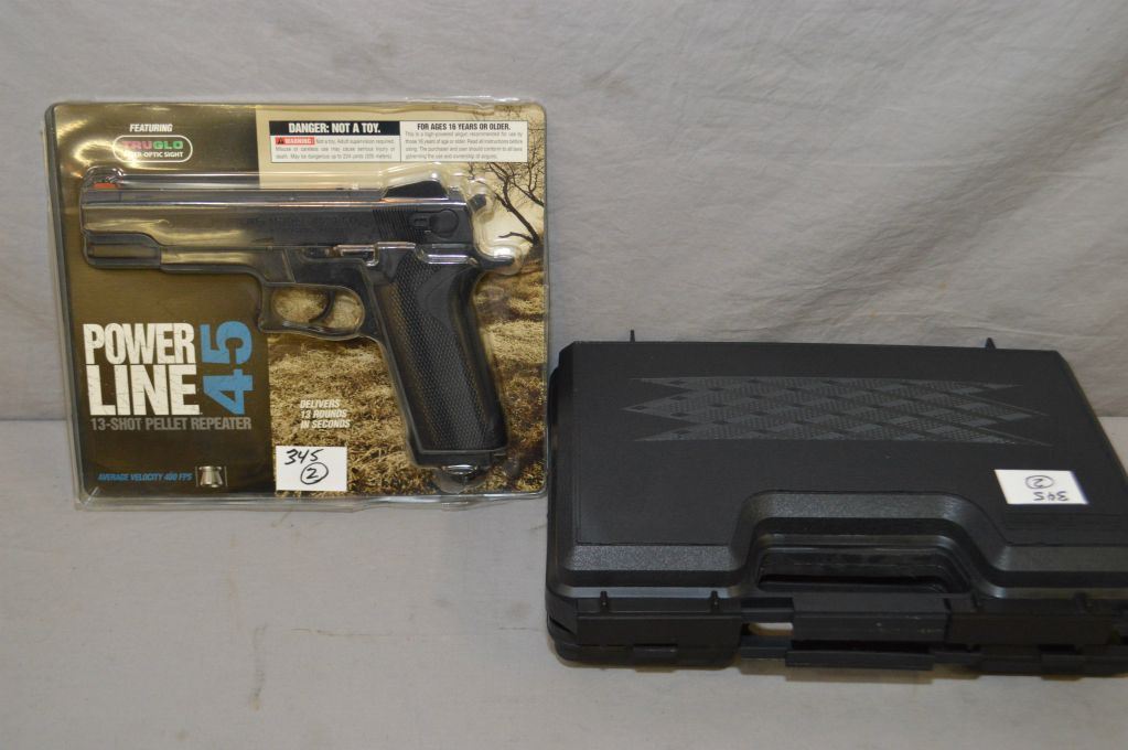 Lot of Two Items - Power Line Model 45 13 Shot Pellet C02 Repeating Pistol [ with original pkg, ] - Gun Guard black plastic foam lined pistol case w/pellets & three C02 Ctgs