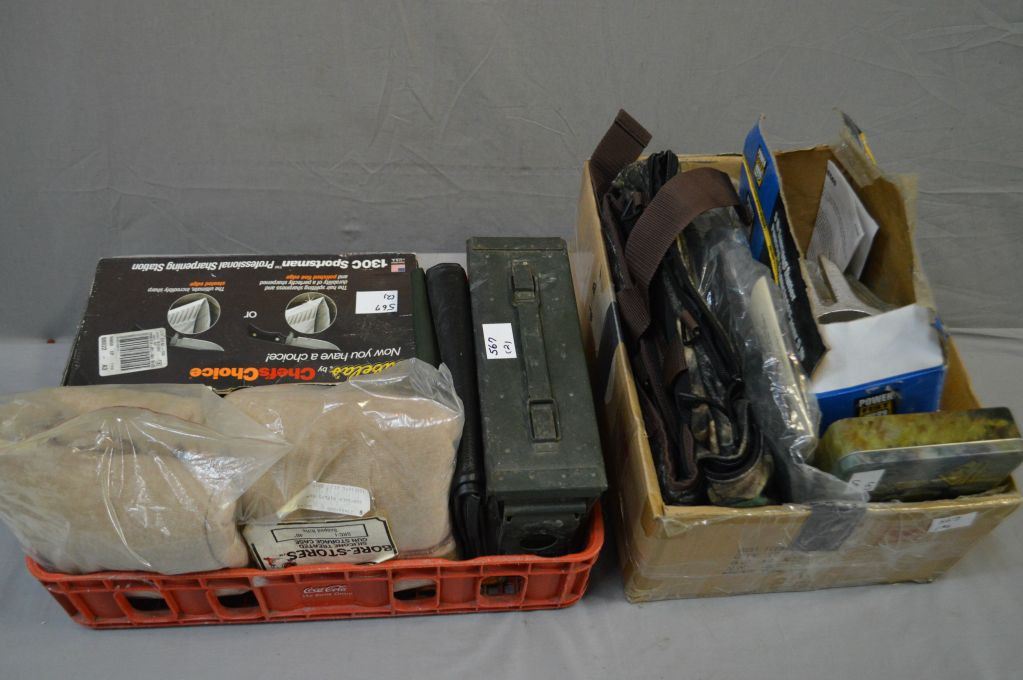 Lot of Two Items : Red Plastic Tray & Box : Camo Back Pack - Two Bags Silicon Treated Gun Cases [ in orig pkg ] - Large Black Nylon Uncle Mike's Shoulder Holster - Gun Cases - Storage Cases - Bow Arm Guard - Cabela's Knife Sharpener in orig box - Three Compasses - Pull Thru - Match Holder - Puma Knife w/ Case in orig tin - Green Metal Ammo Box - Power Fist 5 Lb Sausage Stuffer in orig box, etc.