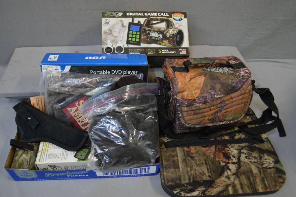 Lot of Two Items Tray & Box : Two Heavy Horns Ratting Bag [ appear new in pkg ] - Garmin GPS # 2 Plus in box - Portable RCA DV Player w/ 7" LCD Screen in box - Side Kick Holster - Pro Fox Game Call w/orig box & carry case - Camo padded seat - Day Walker Camo Waist Pack in pkg - bag w/netting - etc.