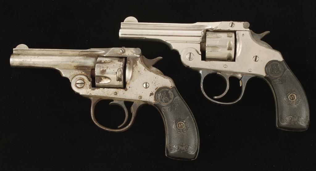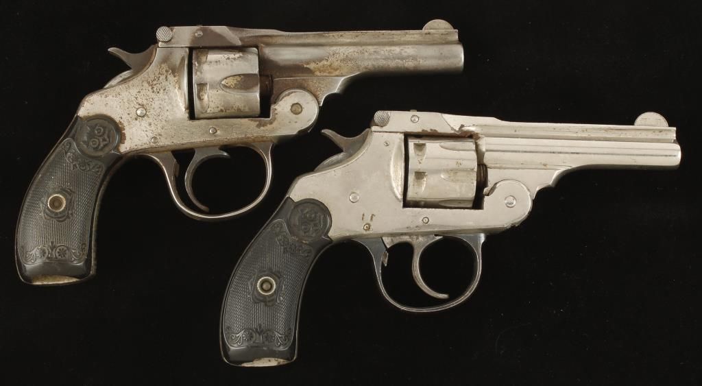 Both are nickel plated double action. One is rimfire and one is centerfire. The centerfire trigger doesn't return forward after the first double action pull. Rimfire is missing the transfer bar and works in single action only. Overall condition for both is poor. *Curio & Relic Firearms*