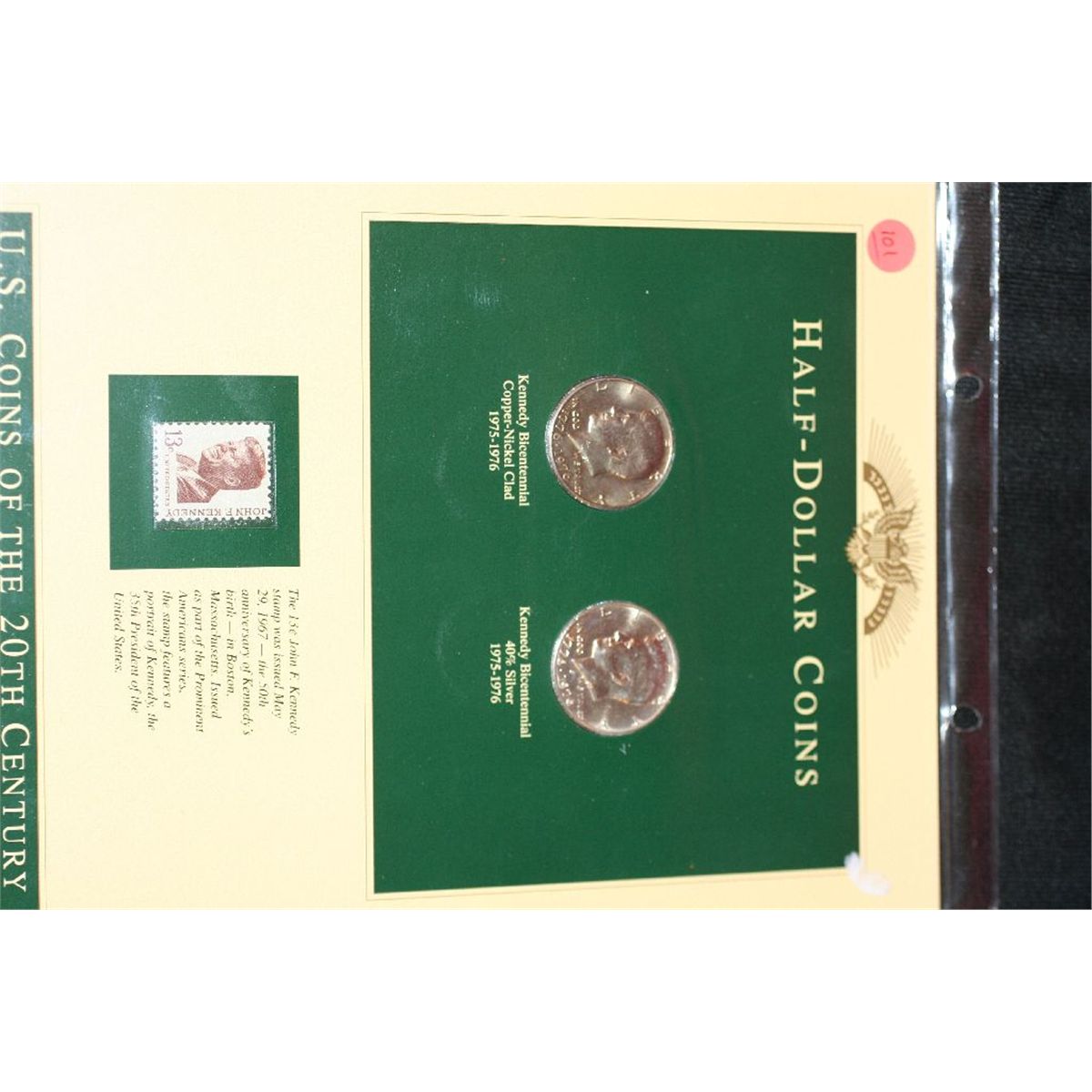 Lot of Two, JFK Half Dollar Coins with 13 cent Commemorative Stamp