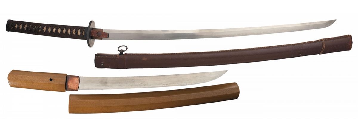 1) Japanese sword, 25 1/2 inch blade with a 35 1/2 inch overall length, featuring a straight hamon, bronze habaki, round iron tsuba, a gold accented kashira, and brown cord over floral menuki. Black lacquered saya, with brown leather sleeve. Tang is unsigned. 2) Shirasaya mounted tanto, 10 1/2 inch blade with wavy temper line and bronze habaki, 15 1/4 inch overall length, and a yellow cloth protective pouch.