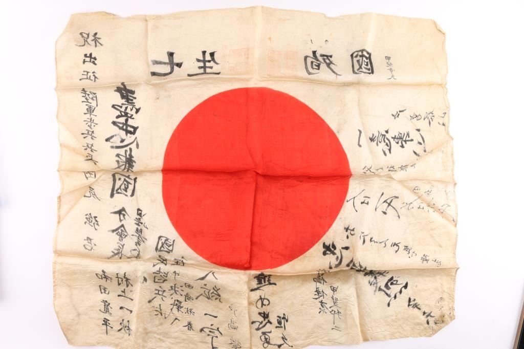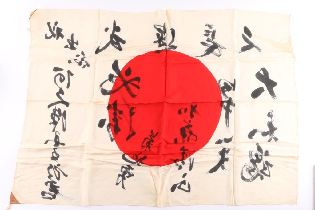 1)The national flag of Japan is a silk white rectangular flag with a crimson-red disc in the center. Leather reinforcement with ties at the top, signed in Japanese in the top left corner. The flag embodies Japan's nickname as the Land of the Rising Sun. Measures 36" x 28". Very good condition, no rips or tears, shows age. 2) Japanese National Silk Good Luck Flag. (Yosegaki Hinomaru) Covered in signatures both large and small, leather reinforcements with ties in the top corners. These flags were taken by Japanese soldiers in to a battle, Family, friends and fellow soldiers and officers did write good wishes on the flag, Measures 30" x 25 1/2", very good condition.