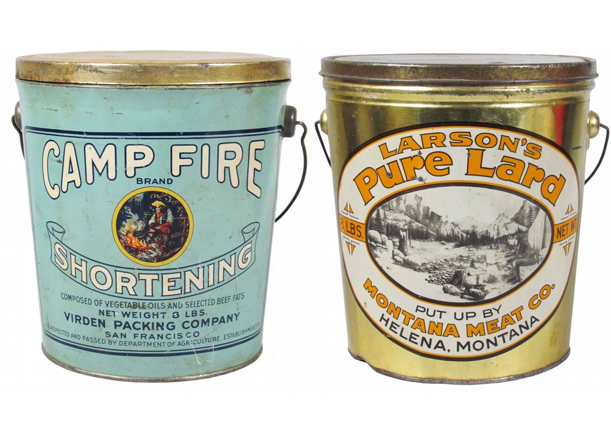 Lot of Two 8# Lard Tin Pails. Camp Fire- San Francisco, CA. Larson's-Helena, MT. Overall very good condition.