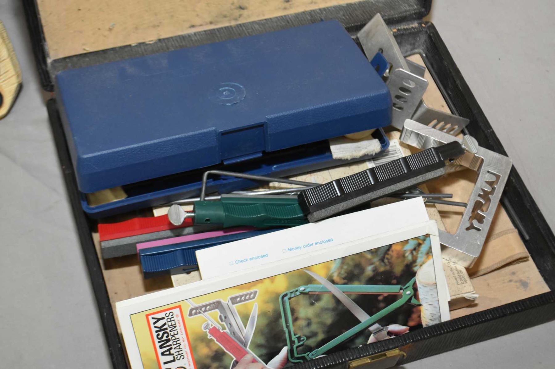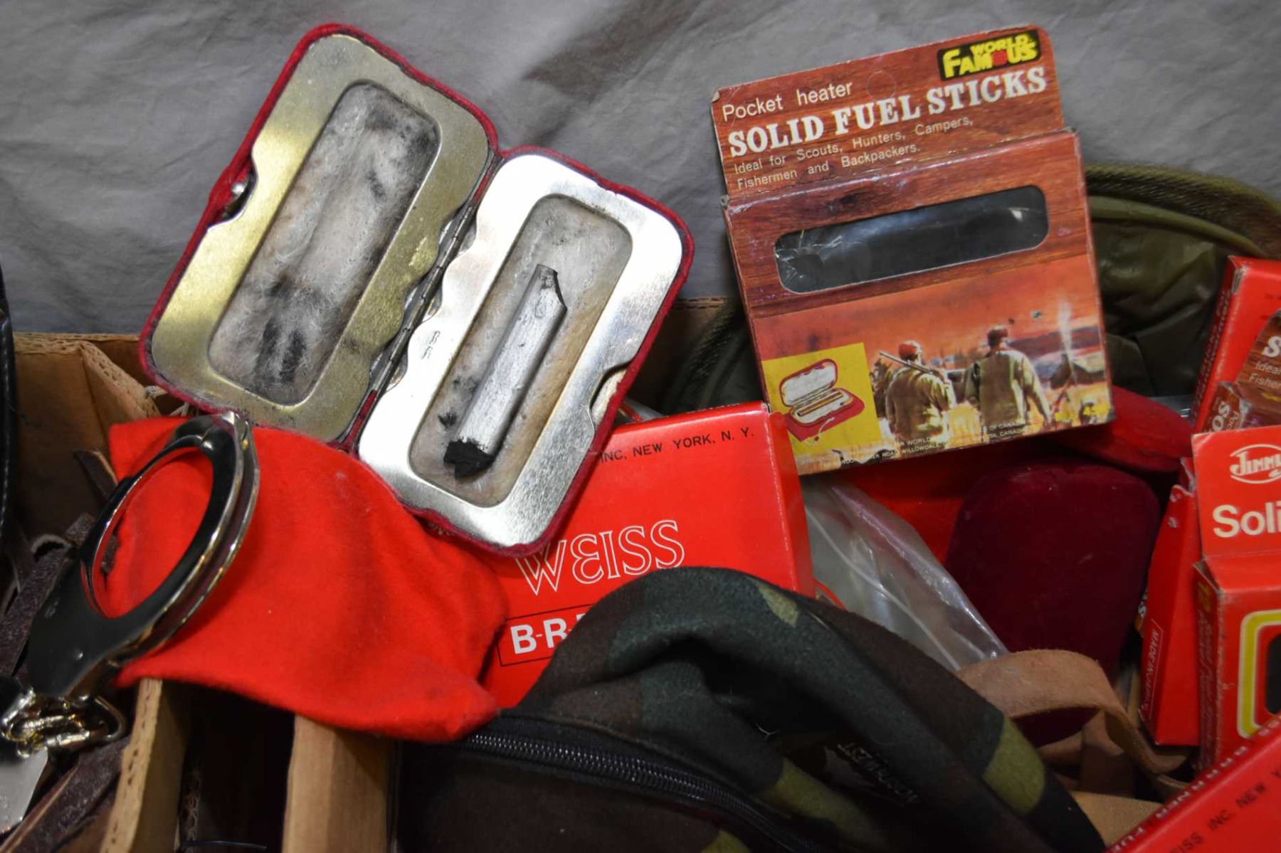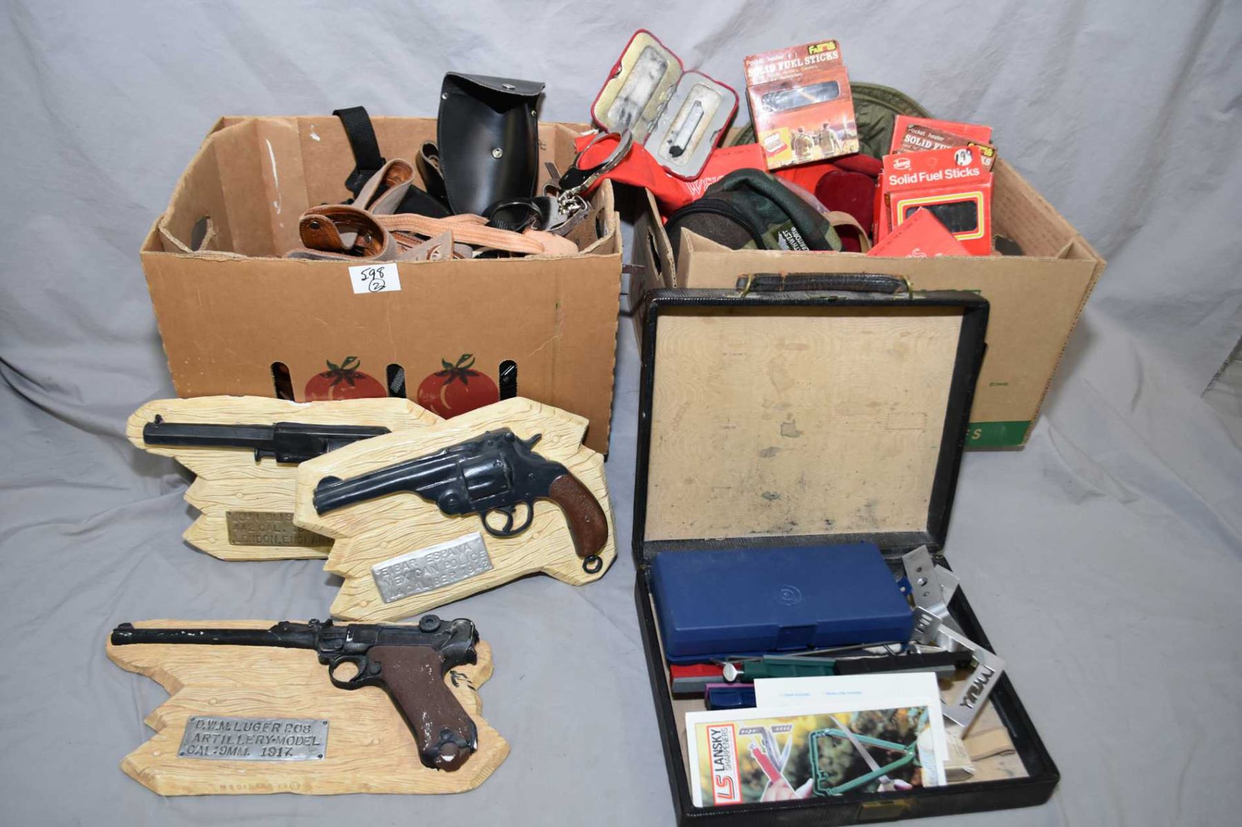 Lot of Two Large Boxes : Assorted Leather Holsters, Pouch w/hand cuffs, belt & holster, ammo belt, leather shoulder holster, black leather holster, asstd web slings, black web holster, pouches, etc., three gun style wall plaques, Knife Sharpener Kit , Deer Bags, Fuel Sticks, etc.
