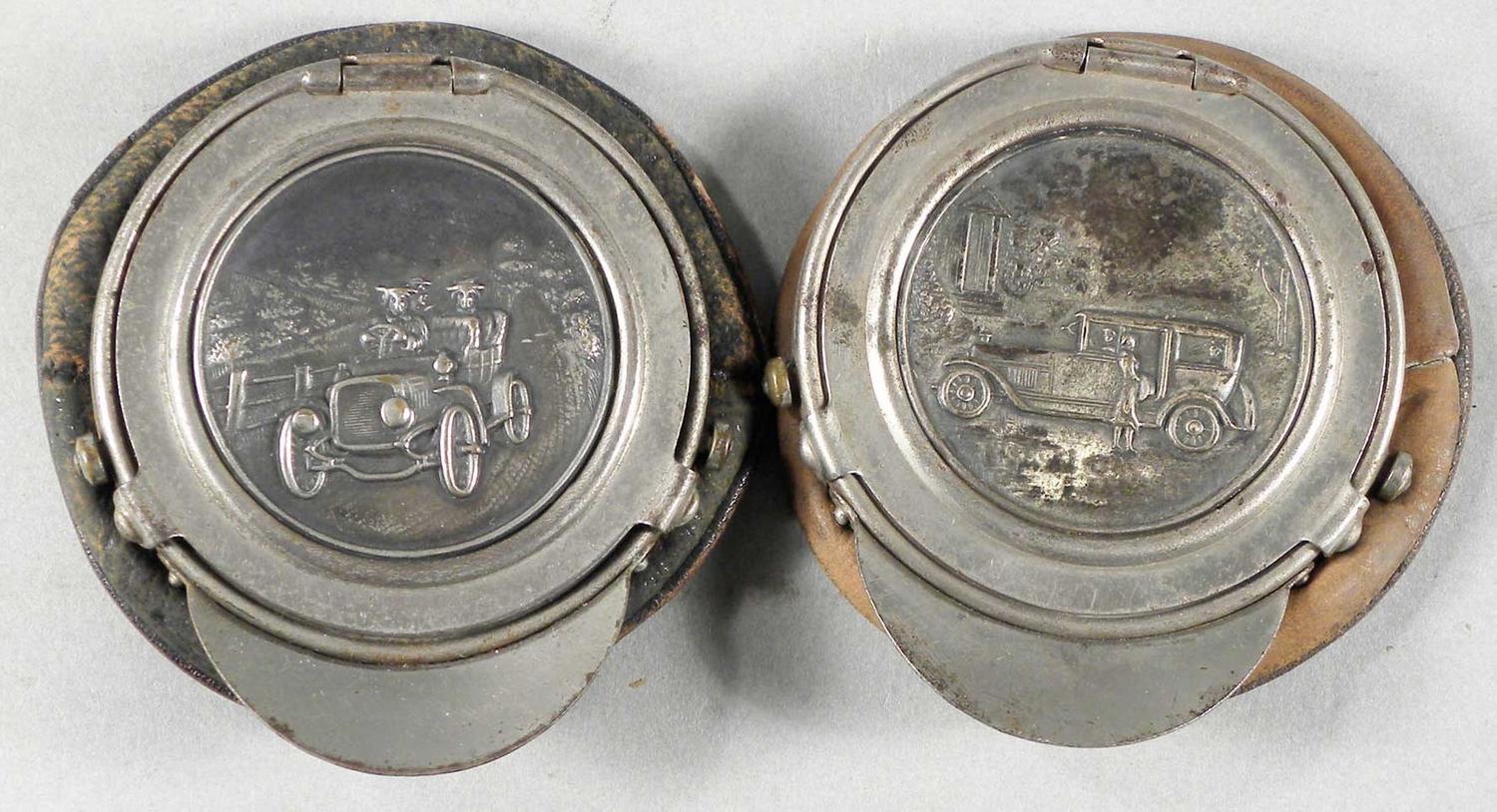Lot of Two Leather Chauffer Coin Purses. Nickel lids embossed with early automobile motif. Nickel is worn off otherwise good condition. Aprox 2 1/2 inch diameter.