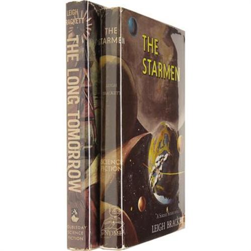 <B>Lot of Two Leigh Brackett First Editions.</B></I> Includes the following:<BR><B><I>The Starmen </B></I></B></I> (New York: Gnome Press, 1952), first edition, 213 pages, grey cloth, 8vo (5.5” x 8.25”), very good in a very good jacket. <BR><B><I>The Long Tomorrow</B></I></B></I> (Garden City: Doubleday and Company, 1955), first edition, 222 pages, beige cloth, 8vo (5.75” x 8.5”), small portion of the front endpaper and half title page glued together (binding error), else very good in a very good jacket. <BR><BR><BR><b>Shipping:</b> Books & Catalogs (<a target="_blank" href="http://www.heritageauctions.com/common/shipping.php">view shipping information</a>)