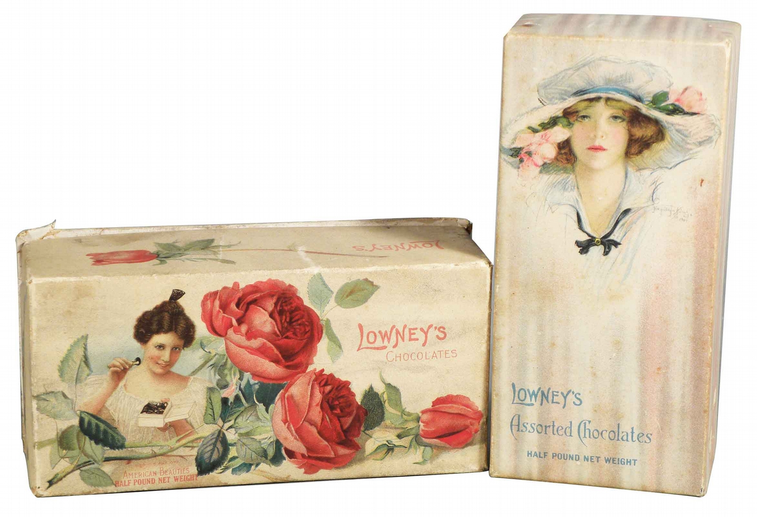 Lot of Two Lowney's Chocolate Boxes. Half pound boxes. Made in the U.S. by The Walter M. Lowney Company Boston, Mass. Original paper lids, some slight staining otherwise very good condition. 2 3/4 X 5 3/4 X 1 1/2 inches.