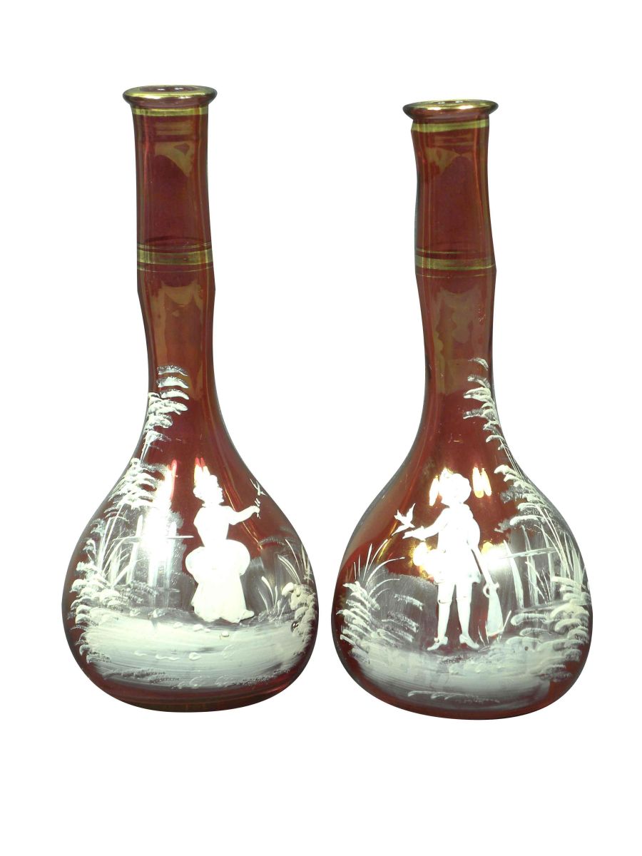 Lot of Two Mary Gregory Barber Bottles, cranberry. Gold rings and rim, white enamel design. No chips or cracks, excellent condition. Each measures Each 8 inches tall.