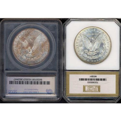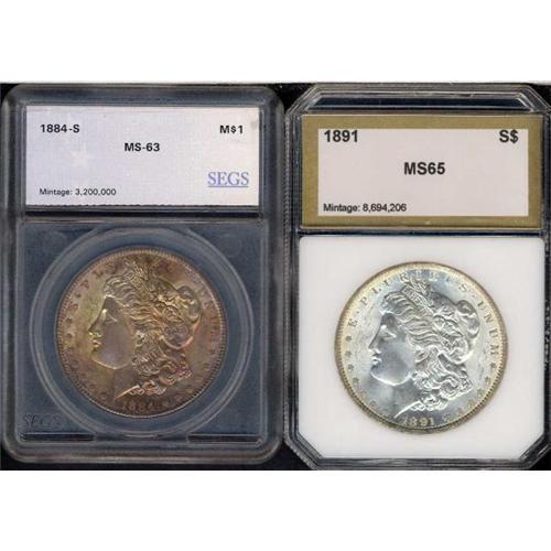 <b>Lot of Two Morgan Dollars.</b> Includes an attractively toned 1884-S Net Grade MS62 (in a SEGS MS63 holder), plus a blazing white 1891 Net Grade MS64 (in a PCI MS65 holder). Lot of 2 coins.
