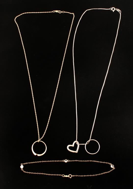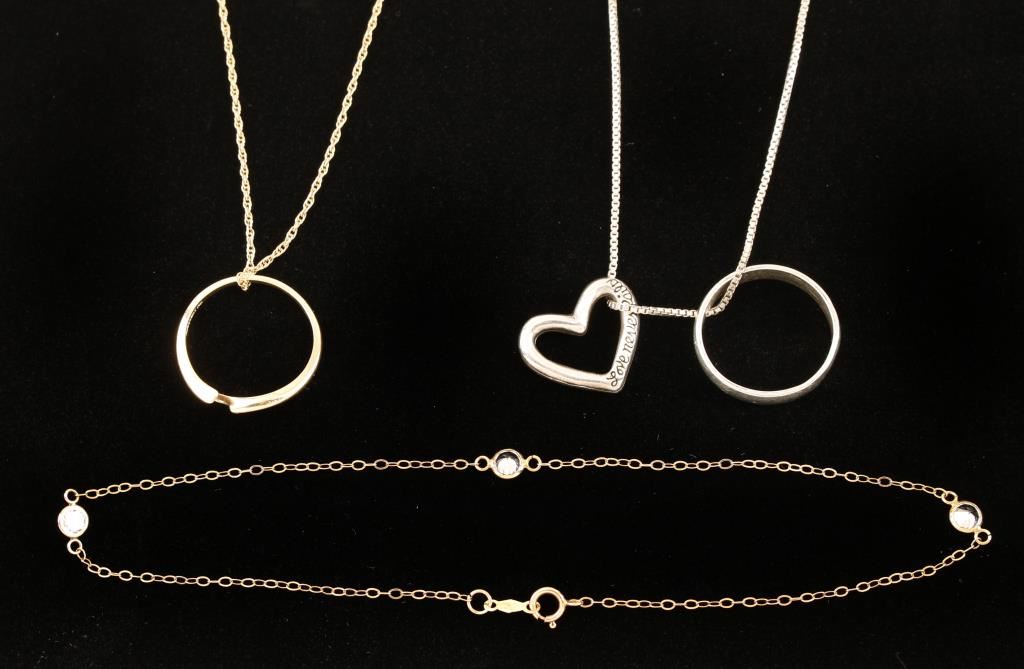 (1) 14Kt Gold Chain with a simple band hanging from it (1) Sterling Chain with a Sterling heart with 1Coin and sterling band and (1)10KT yellow gold bracelet with rhinestone accents.