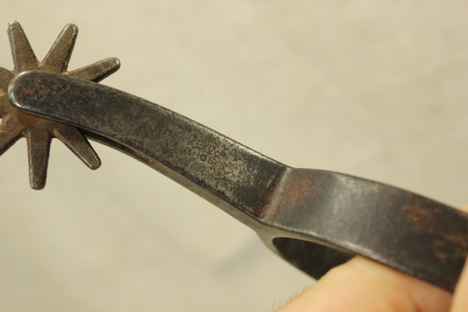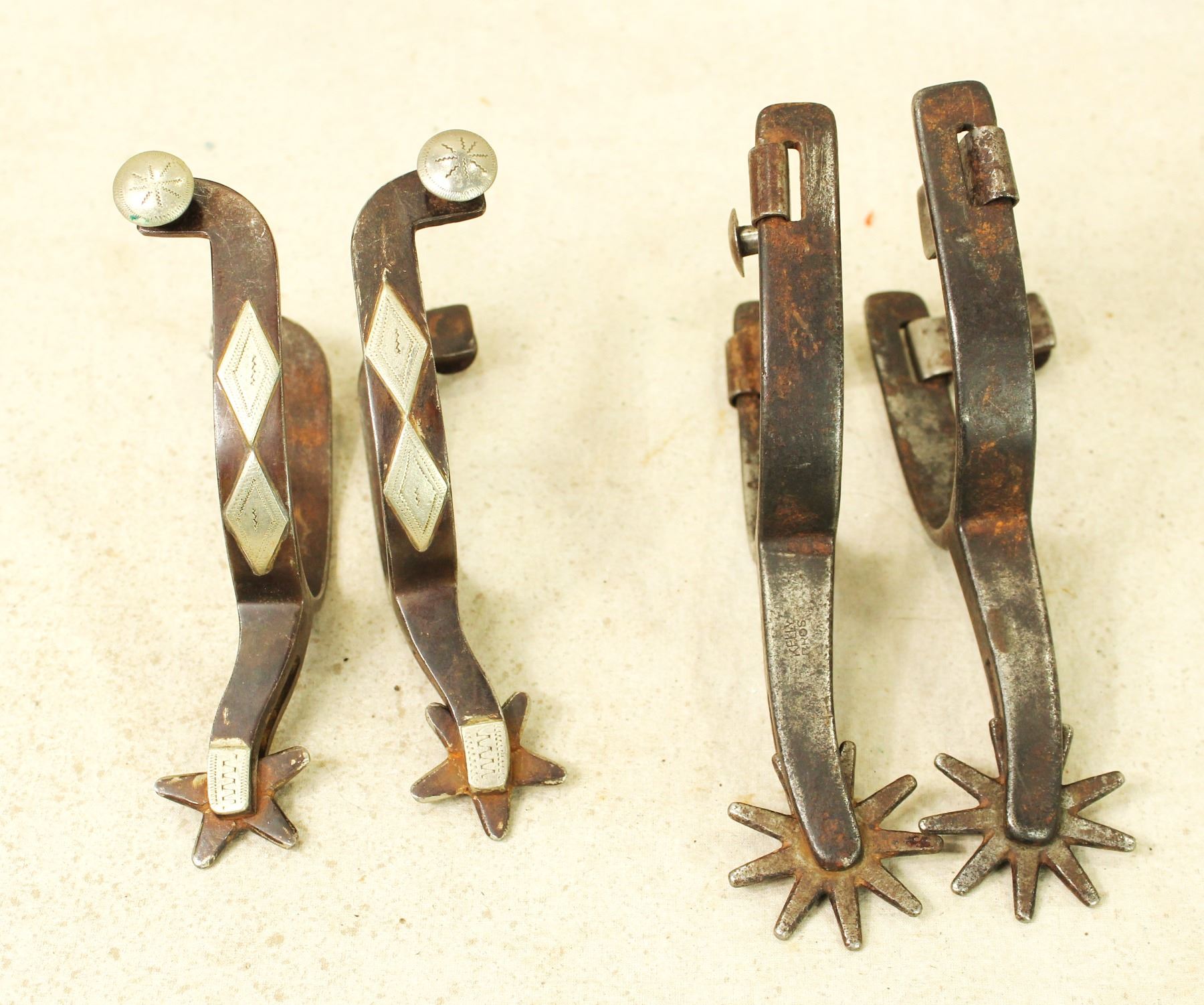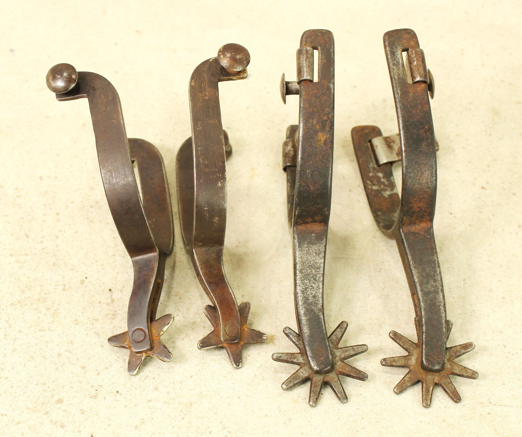A grouping of two pairs of spurs, that includes a marked pair of single mounted McChesneys, and a pair of iron Kelly Bro's. Showing good patinaed condition.