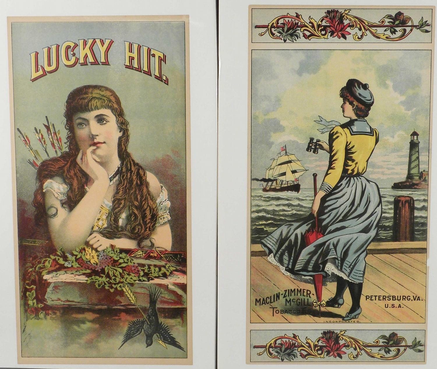 Lot of Two Paper Tobacco Labels. "Lucky Hit." and Maclin-Zimmer-McGill Tobacco Co. Girl looking out to sea has minor paper loss at 4:00 otherwise both are in near mint condition. Aprox 7 X 13 1/2 inches. Start Price $20