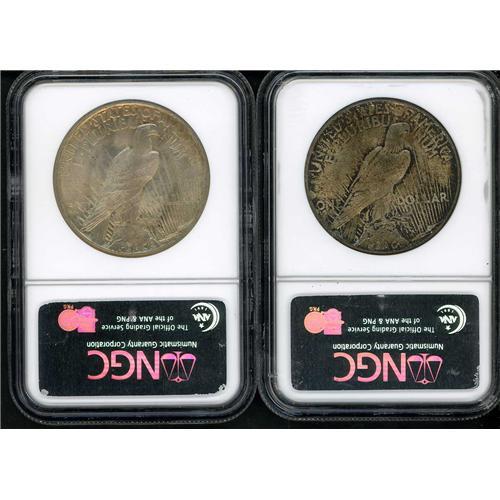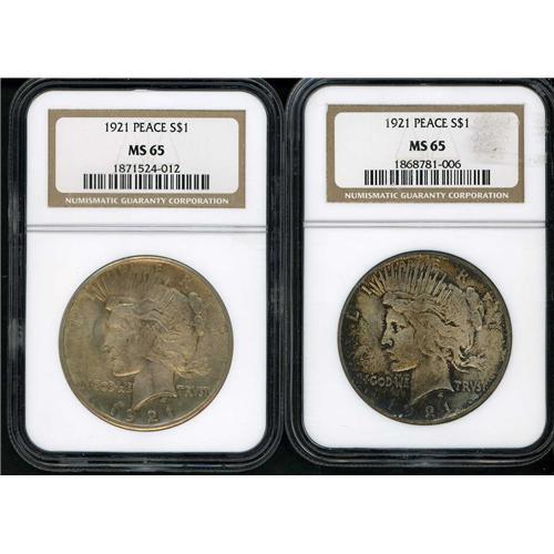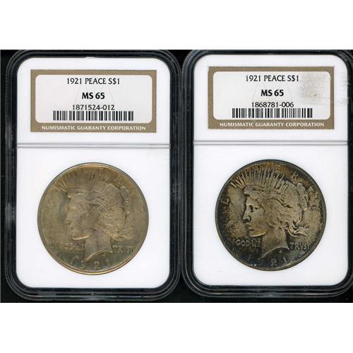 Lot includes two coins, both richly toned 1921 Peace Dollars NGC MS65. Lot of 2 coins.