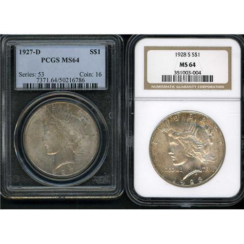 Lot includes: 1928-S NGC MS64, 1927-D PCGS MS64. Lot of 2 coins.