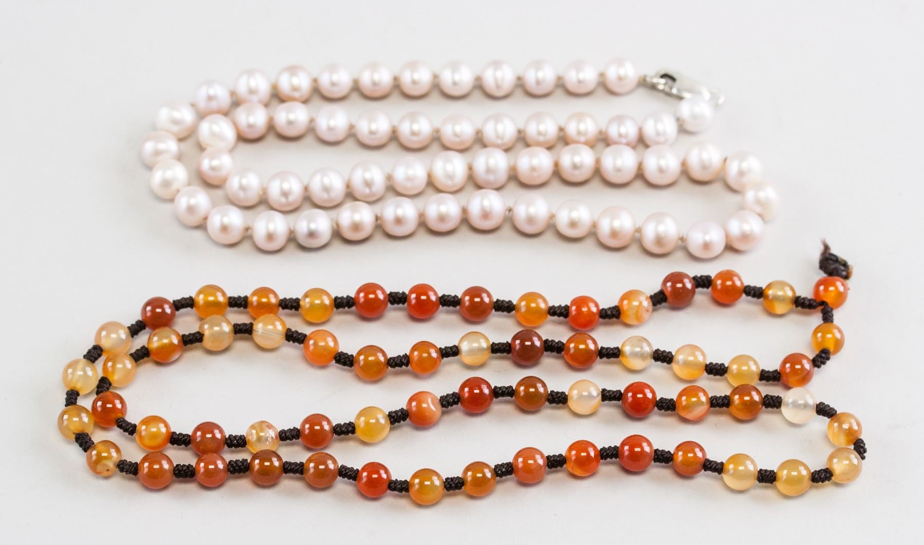 Lot of two (2) pearl and agate necklace. Both with small round beads. Diameter: 15 cm, 50 grams.