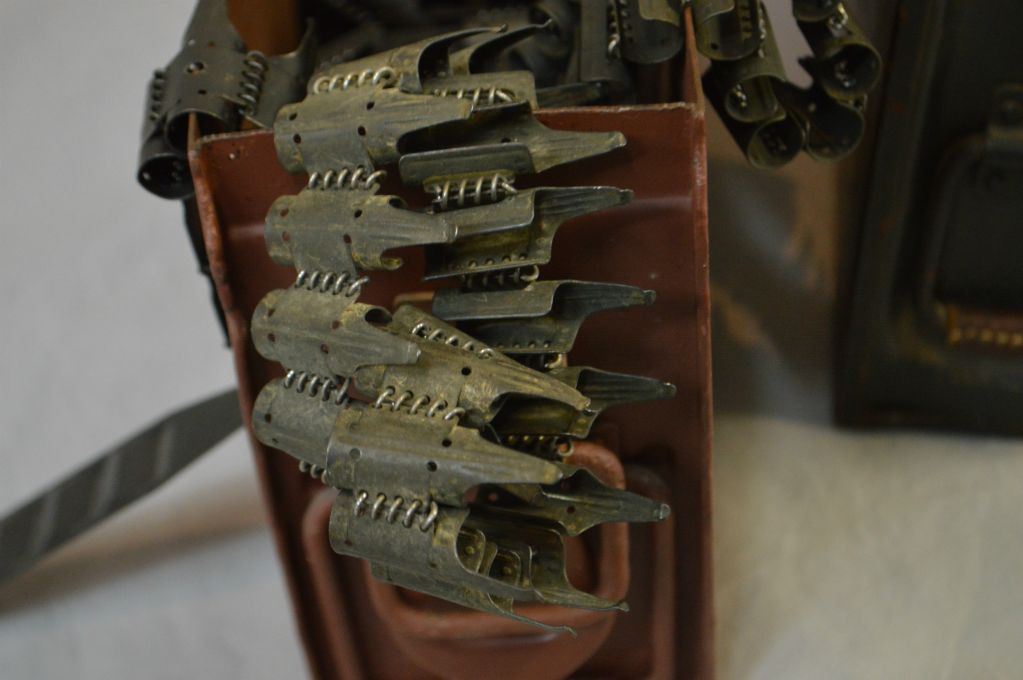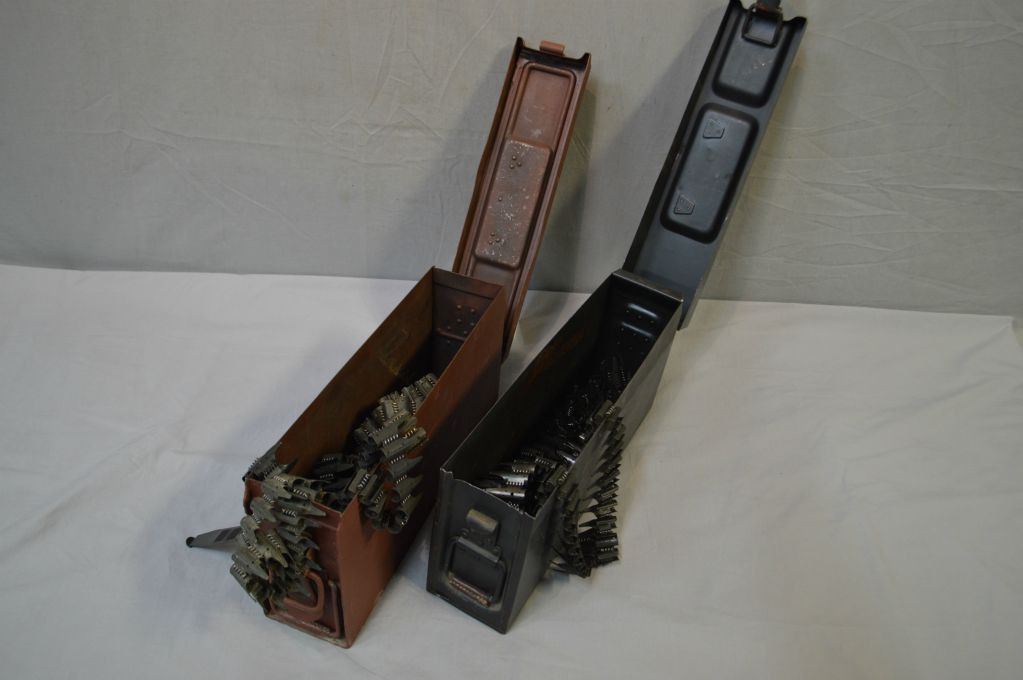 Lot of Two Period Correct German .8 MM Ammunition Metal Boxes [ one black, one red, each containing Five 50 Rnd Belts & One starter tab ]