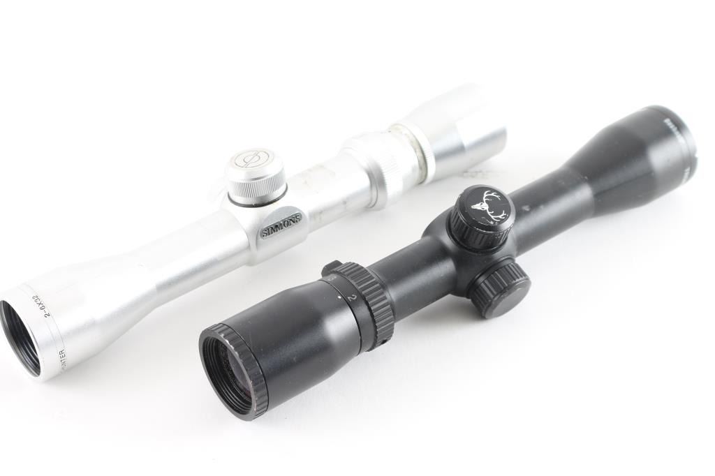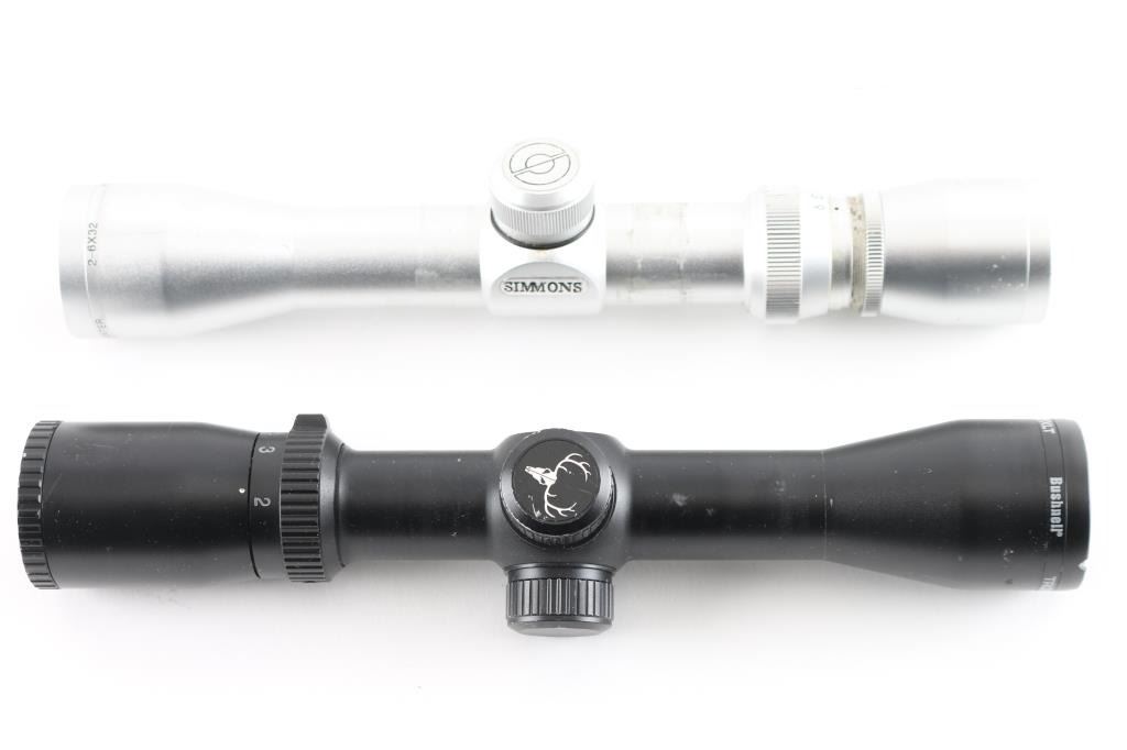 1) Bushnell Trophy XLT 2-6x32, long eye relief, duplex reticle, clear view, overall good condition 2) Simmons Prohunter 2-6x32, long eye relief, duplex reticle, clear view, overall good condition, silver finish