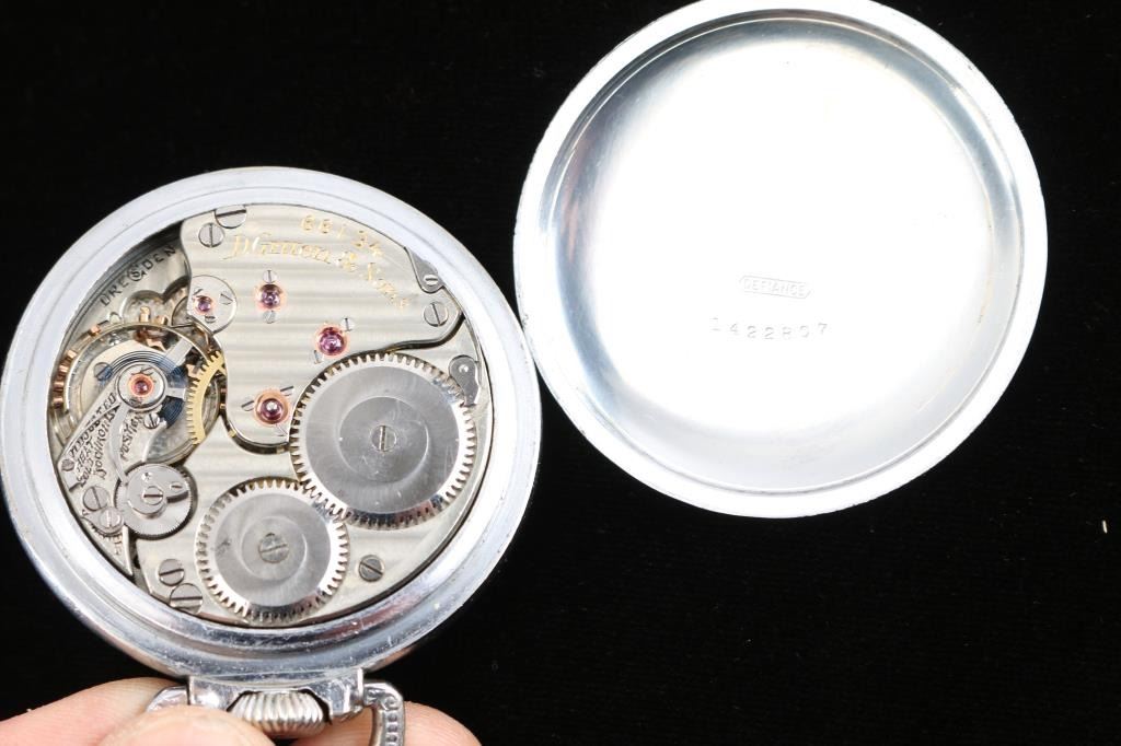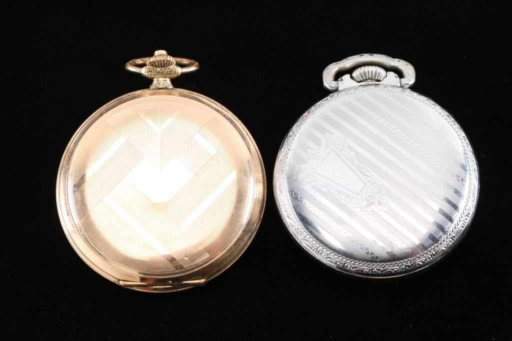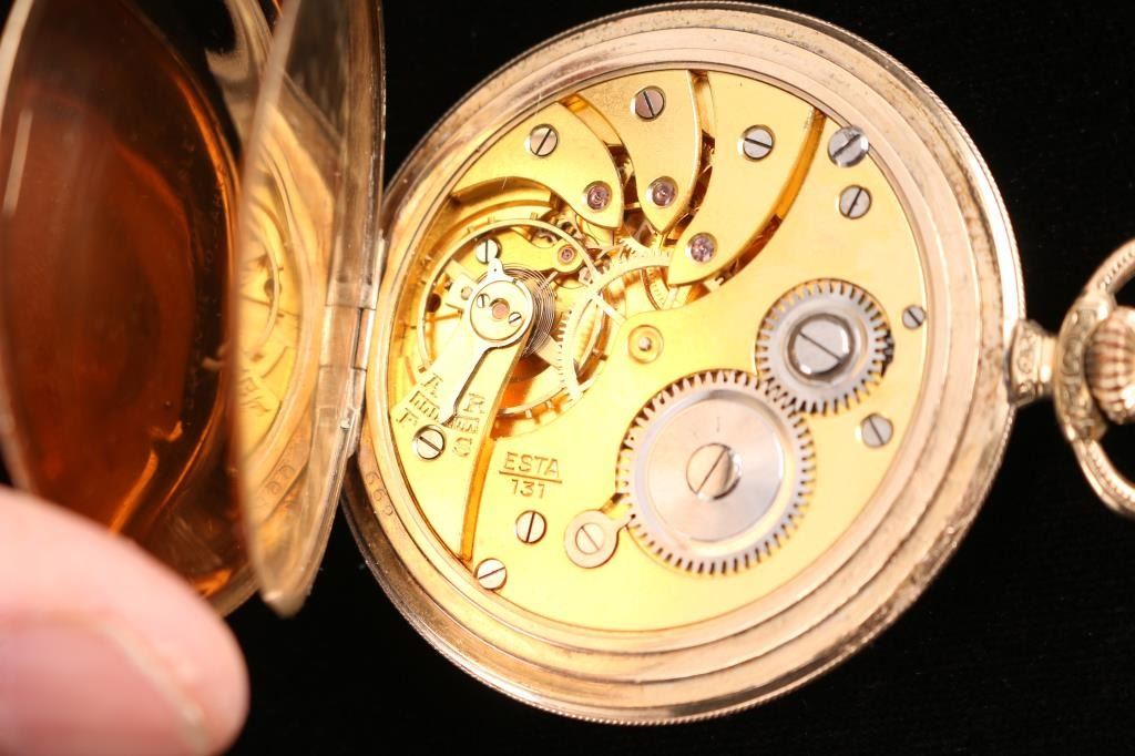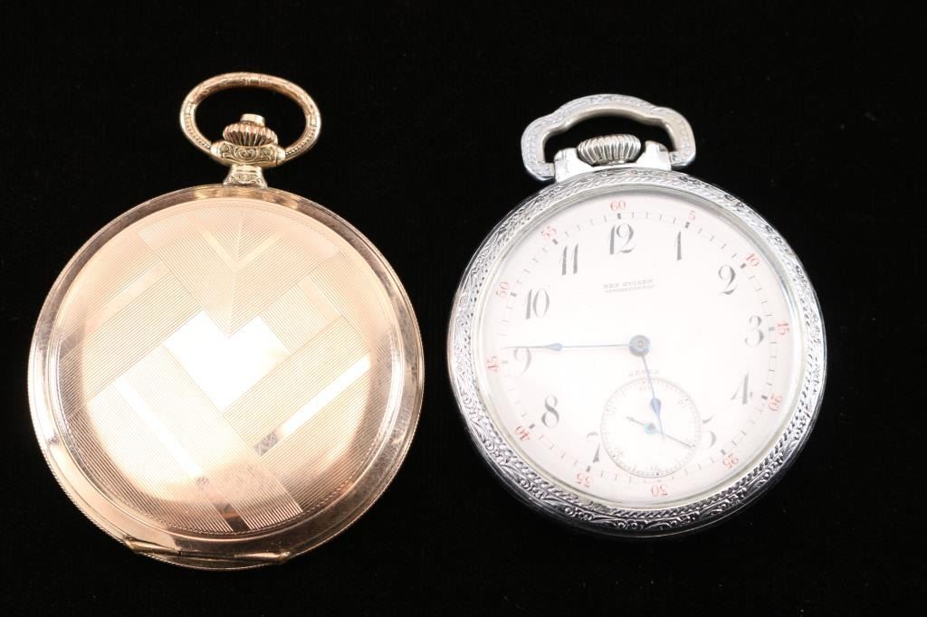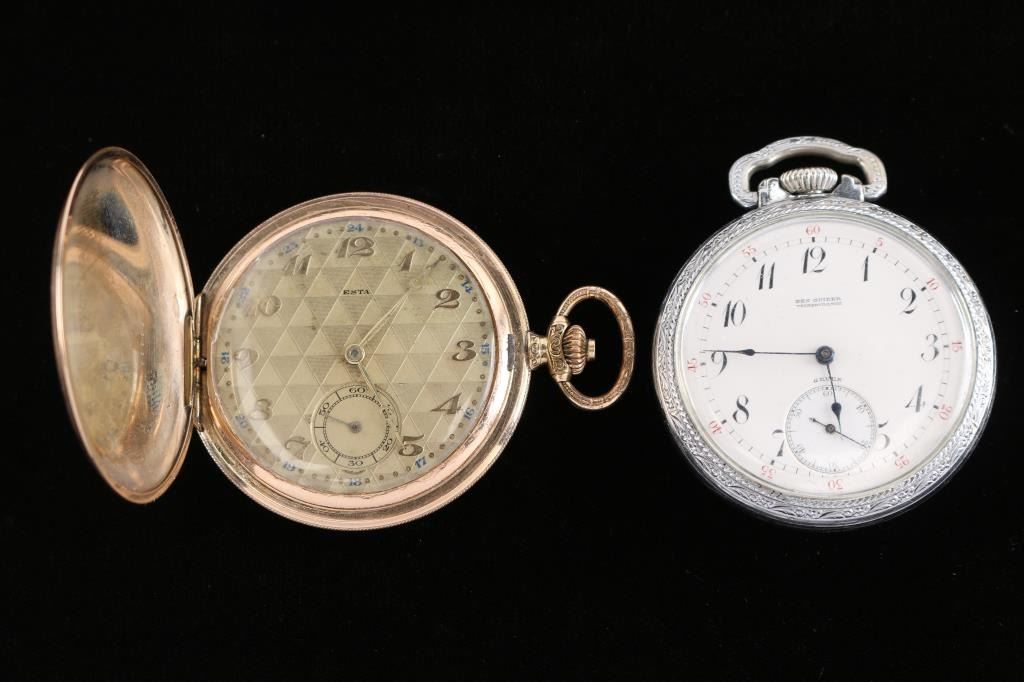 1) Gruen 19 ligne, 21 jewel. Number 66134, manufactured circa 1870. Private label on face, "Ben Guilder Vicksburg, Miss". Defiance base metal case. In good working order. 2) Swiss made Esta model 131, 10 ligne, 15 jewel. Case marked "Walz Double Gold, 20 Mikron, Garantie 10 Jahre" means that the case is made of rolled gold (the thickness of the gold plate is 20 microns) and the plating is guaranteed for 10 years. Geometric designs on case. In good working order.