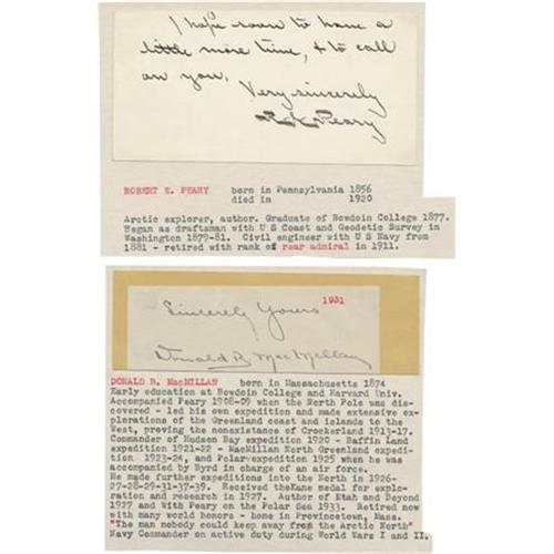<B>Lot of Two Polar Explorer Signatures,</B></I> including <B>Robert E. Peary</B></I> (1856-1920), an American explorer who claimed to have been the first person, on April 6, 1909, to reach the geographic North Pole. Peary made several expeditions to the Arctic, exploring Greenland by dog sled in 1886 and 1891 and returning to the island three times in the 1890s. Unlike many previous explorers, Peary studied Inuit survival techniques, built igloos, and dressed in practical furs in the native fashion. Peary also relied on the Inuit as hunters and dog-drivers on his expeditions, and pioneered the use of the system (which he called the "Peary system") of using support teams and supply caches for Arctic travel. He also had 8 toes amputated but kept walking; and, <B>Donald Baxter MacMillan</B></I> (1874-1970) was an American explorer, sailor, researcher and lecturer who made over 30 expeditions to the Arctic during his 46-year career. He pioneered the use of radios, airplanes, and electricity in the Arctic, brought back films and thousands of photographs of Arctic scenes, and put together a dictionary of the Inuktitut language. Both clipped from larger documents and mounted on stiff card stock with brief typed biographical information. Both are fine. <B></B></I><BR><BR><b>Shipping:</b> Flat Material, Small (<a target="_blank" href="http://www.heritageauctions.com/common/shipping.php">view shipping information</a>)