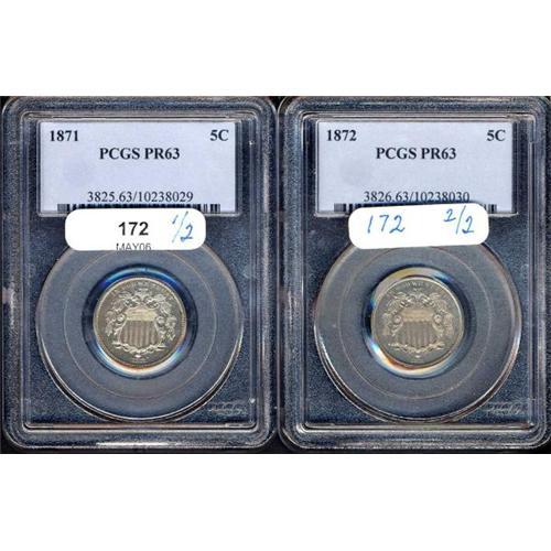 <b>Lot of Two Proof Shield Nickels: 1871 and 1872.</b> Includes: 1871 PCGS PR63 and 1872 PCGS PR63. Lot of 2 coins. <i>
