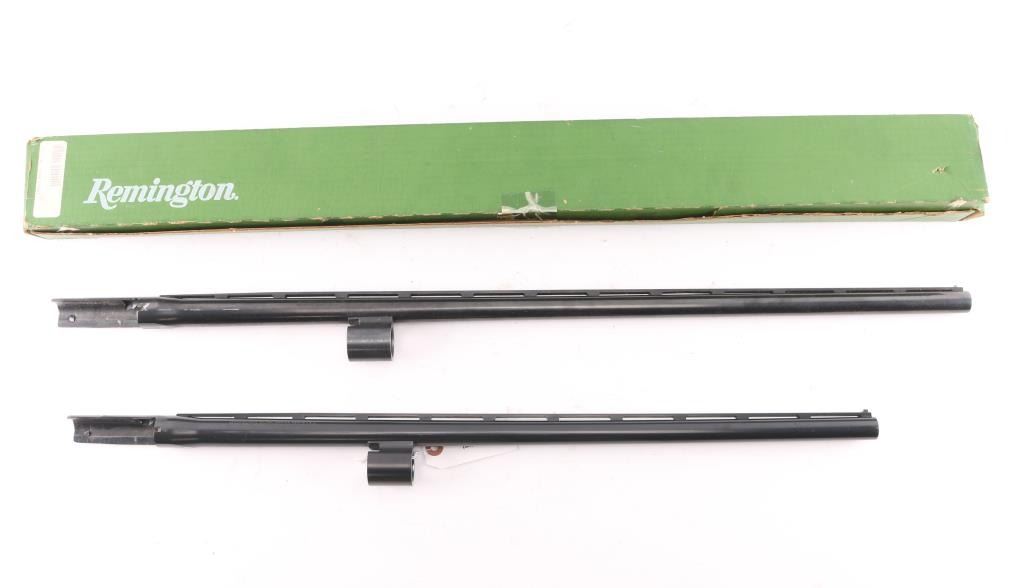all appear to be for model 1100, not test fitted during inspection. #1) 30" blued barrel, 12 Ga. for 2-3/4" shells, full choke, vent rib with front steel bead sight, excellent and bright bore, very good condition with slight edge wear, retains a 85% blue finish and comes in factory box. #2) 25 5/8" blued barrel, for 2-3/4" or shorter shells, skeet choke, tall trap style vent rib with white Bradley front & white polymer mid bead, good exterior condition with some edge wear, 80% finish, bore is very good and bright.