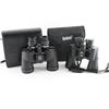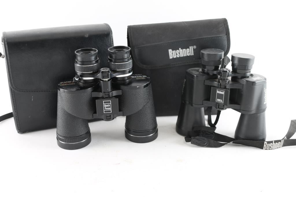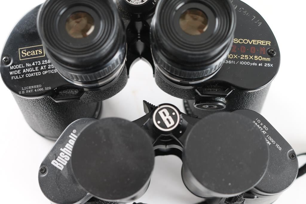 1) Vintage Sears "Discoverer" 10-25x50mm. Made in Japan. Good or better condition, previous owner marked with electric pencilled numbers, clear optics, with case. 2) Bushnell 10x50, good condition, in case.