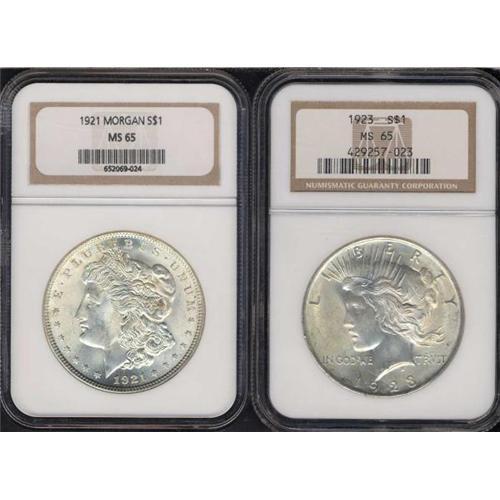 <b>Lot of Two Silver Dollars.</b> Includes: 1921 Morgan NGC MS65 and 1923 Peace NGC MS65. Lot of two coins.