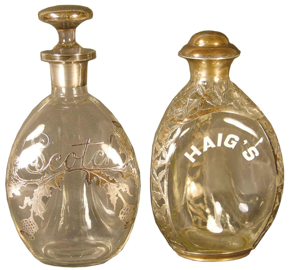 Two Silver Overlay Liquor Bottles. One scotch the other Haigs. Excellent condition. Aprox 8 inches tall.