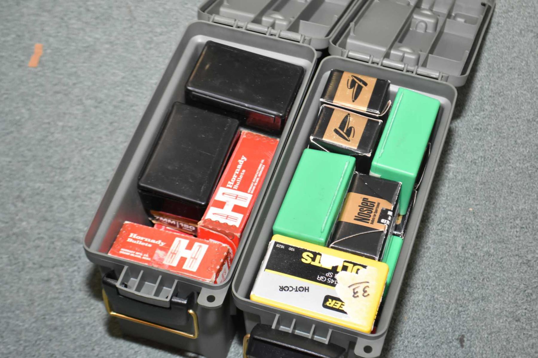 Lot of Two Small Green Plastic Ammo Boxes : Full of Bullets .7 MM or .284 Diam
