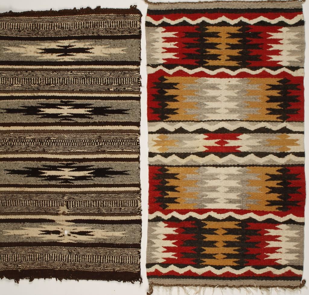 (1) Hand woven wool textile made with grey, black, red, white, and yellow material with fringe on one side. Measures 35" x 19" in good condition. (1) Hand woven wool textile made with brown, beige, and gray material. Measures18" x 33" in fair condition with tears and fraying.