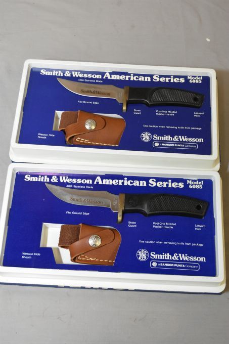 Lot of Two Smith & Wesson American Series Model 6085 Collector's Hunting Knives w/leather scabbards [ new in original boxes, Circa Late 1970's ]