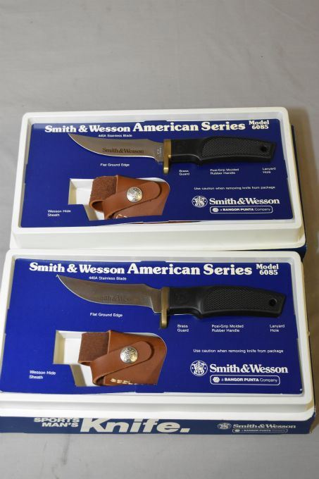 Lot of Two Smith & Wesson American Series Model 6085 Collector's Hunting Knives w/leather scabbards [ new in original boxes, Circa Late 1970's ]