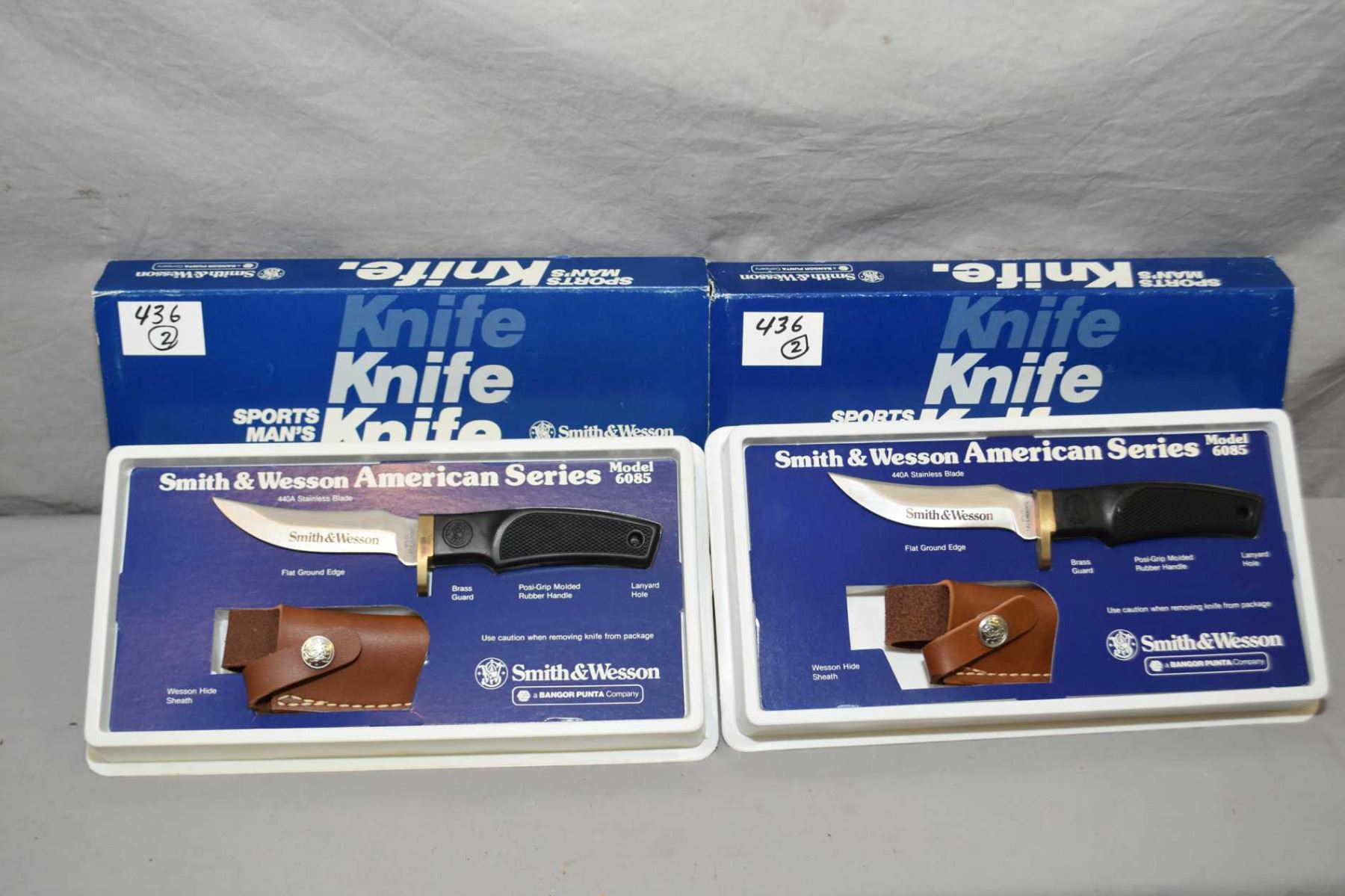 Lot of Two Smith & Wesson American Series Model 680 Hunting Knives [ wtih brass guard, Smith & Wesson rubber handles, w/leather sheaths in original boxes, As New, Circa 1970's ]