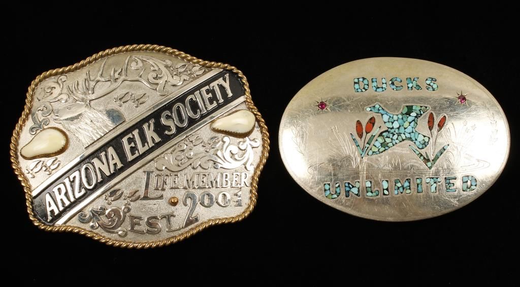 One is for Ducks Unlimited made with inlaid turquoise chip/coral mosaic and two small red stones. The other is for the Arizona Elk Society with two inlaid elk teeth and has "Life Member" and "Est. 2001" on it.